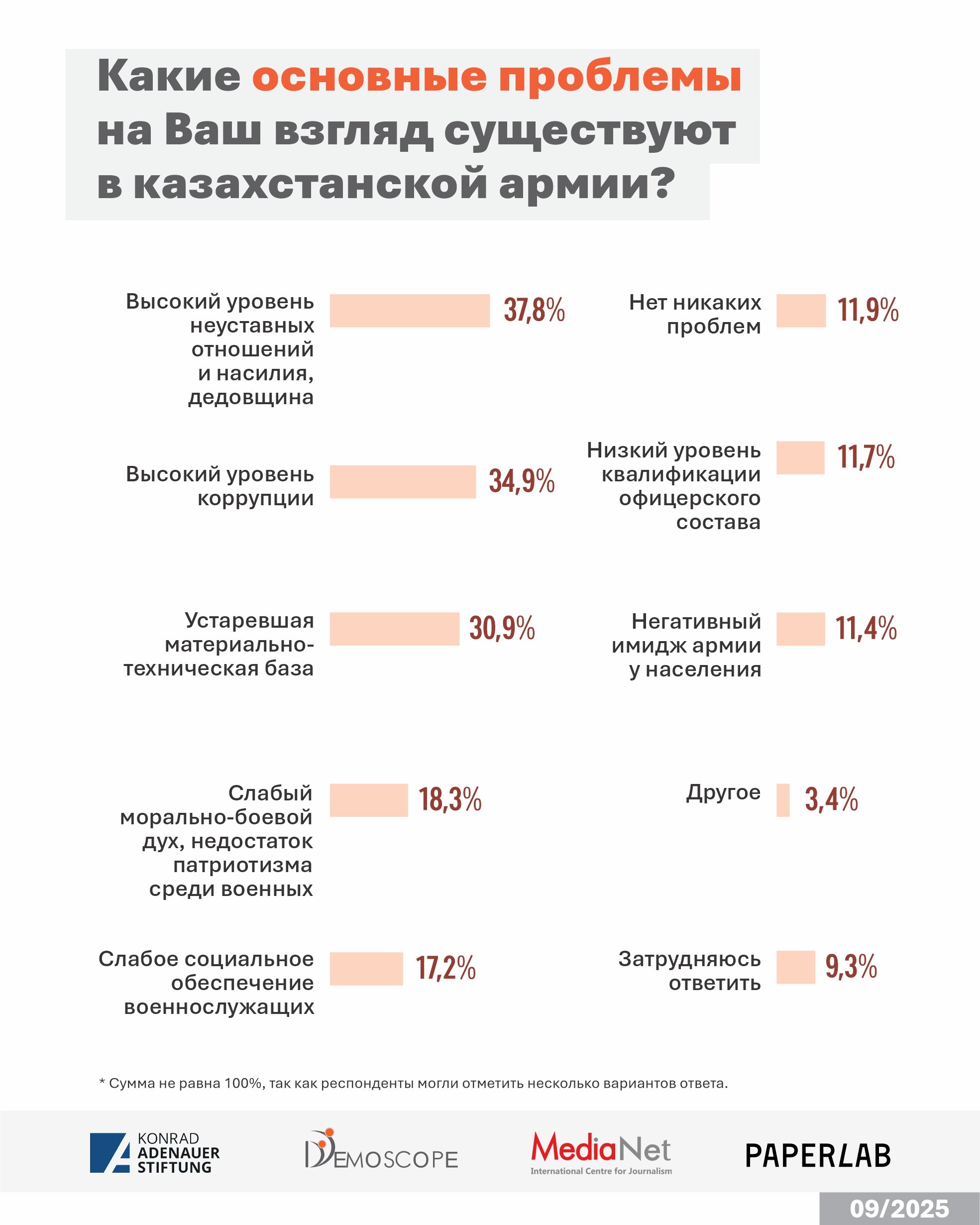 Среди главных проблем казахстанской армии люди назвали высокий уровень неуставных отношений и насилия, коррупцию и устаревшее оснащение.