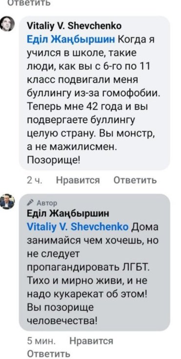Представитель ответчика — адвокат Шолпан Сарсенова заявила, что высказывания депутата в комментарии в Facebook — «Виталий Шевченко, дома занимайся, чем хочешь, но не следует пропагандировать ЛГБТ. Тихо и мирно живи и не надо кукарекать об этом! Вы позорище человечества!» — это только оценочные суждения.