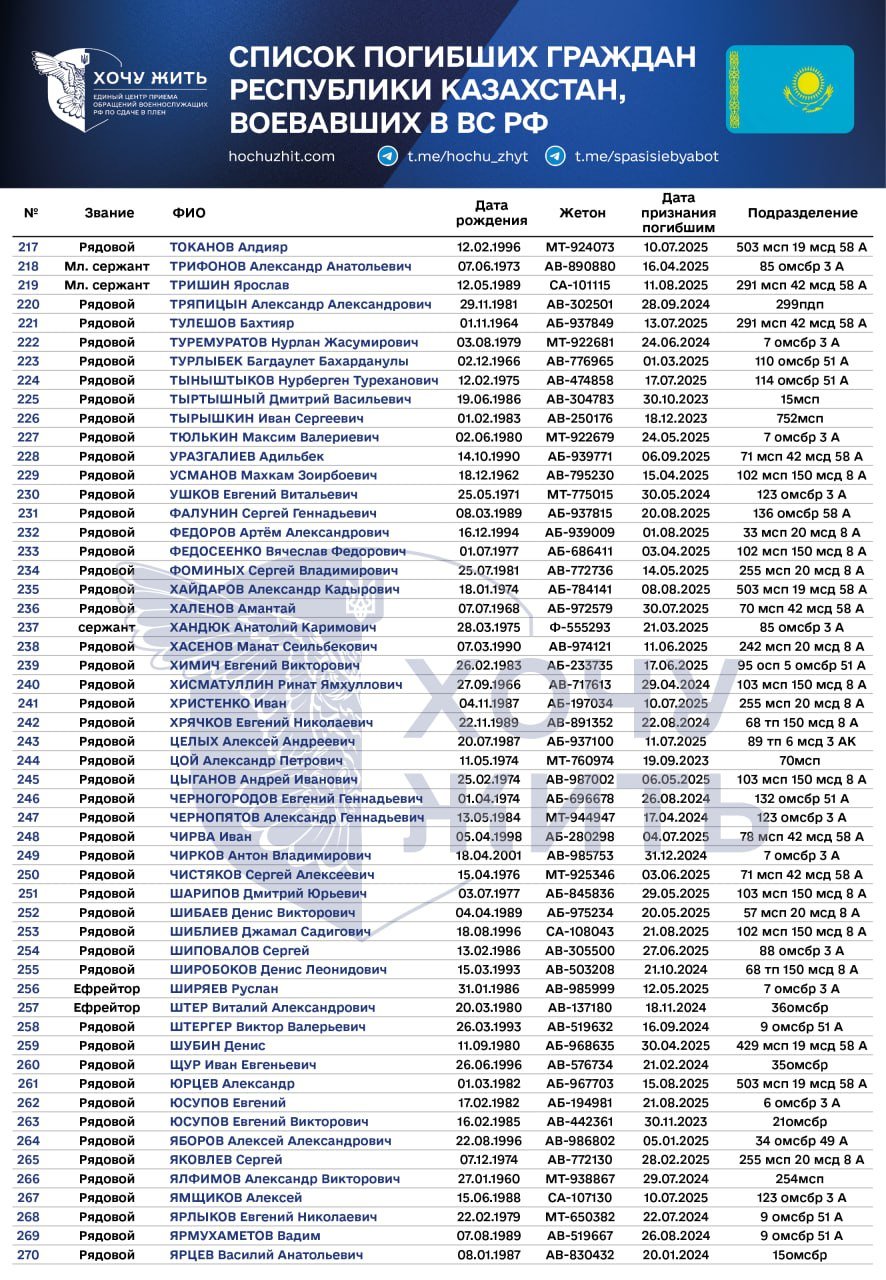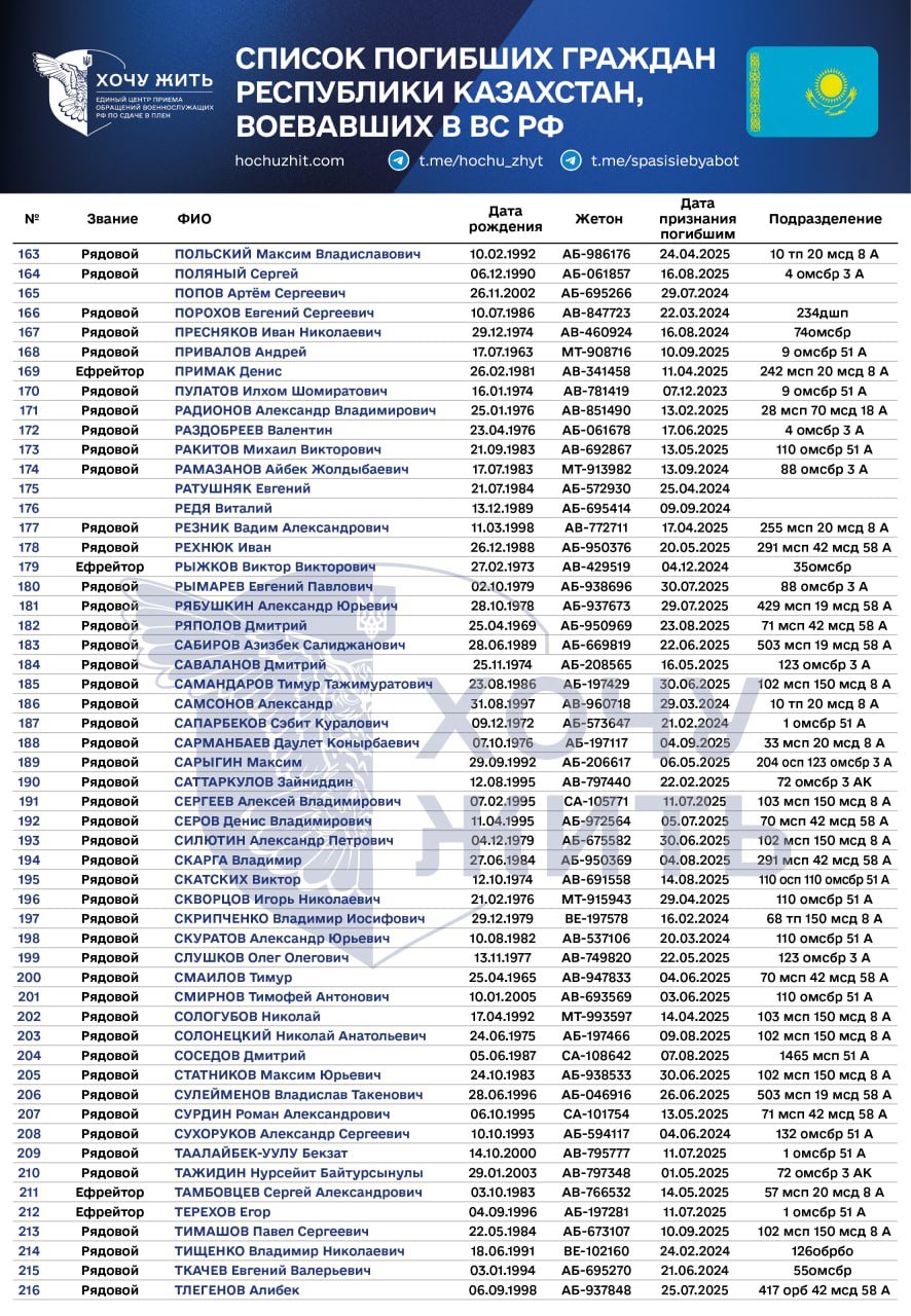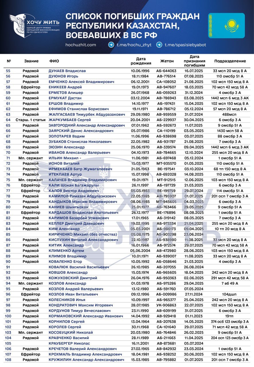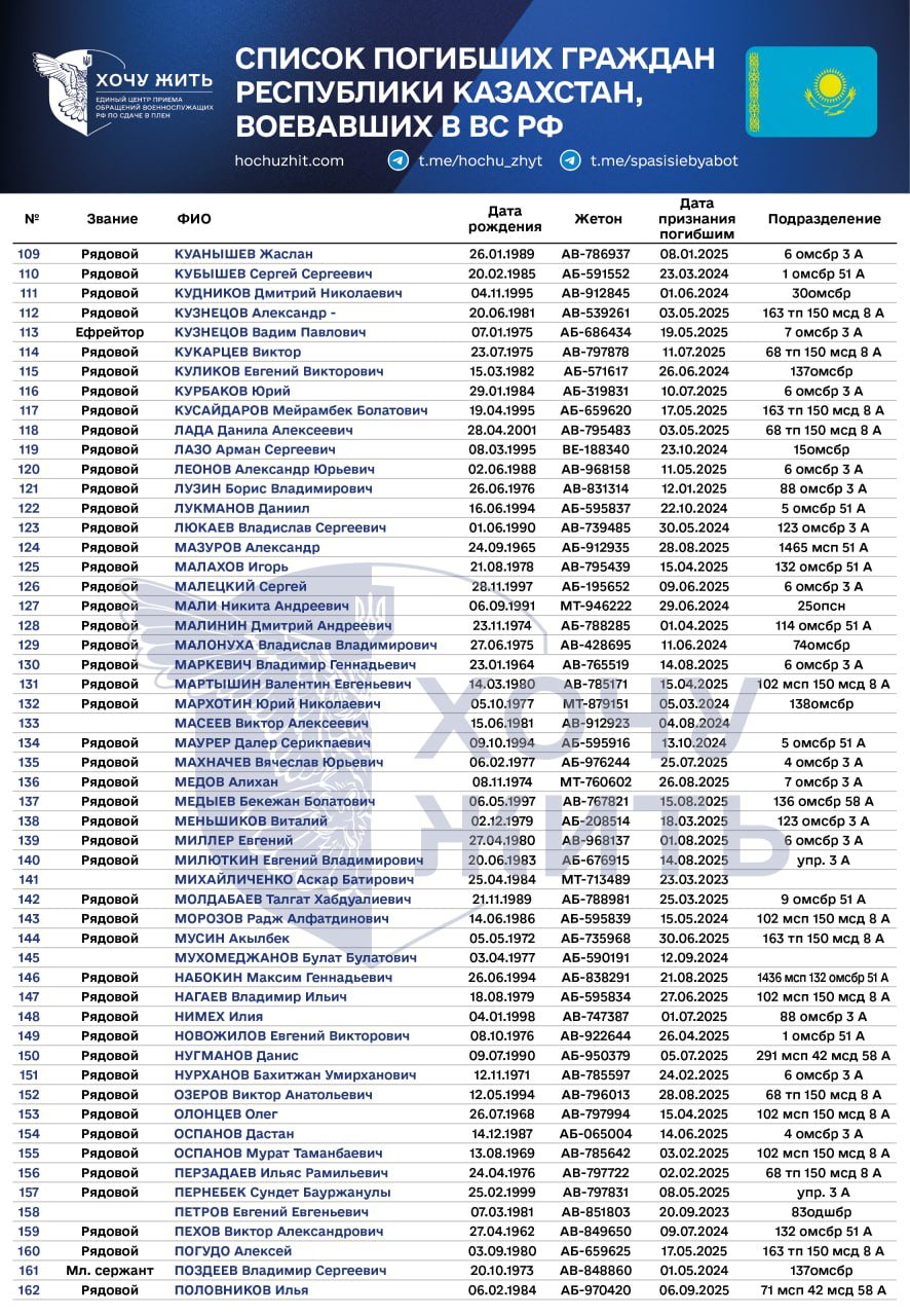 Судя по данным «Хочу жить», даты смерти казахстанцев, воевавших в 110-й бригаде, делятся почти поровну — весна 2024-го и весна-лето 2025-го. В марте 2024-го бригада получила благодарность от тогдашнего министра обороны РФ Сергея Шойгу за «освобождение» Авдеевки. Стоит предположить, что часть граждан РК там и погибла. В начале 2025 года 110-я участвовала в наступлении на город Курахово Донецкой области. А сейчас, как и многие из упомянутых здесь подразделений, находится на Покровском выступе и пытается наступать на Мирноград.