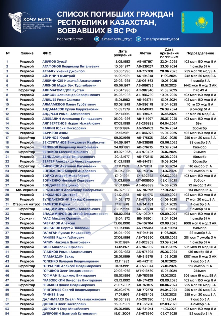 Как видно, указанные в нём граждане Казахстана служили в самых разных подразделения вооружённых сил РФ. Всего мы насчитали почти 70 — от разведывательных батальонов до управления отдельных армий. Но всё-таки в большинстве своём это мотострелковые полки и бригады. Пехота.