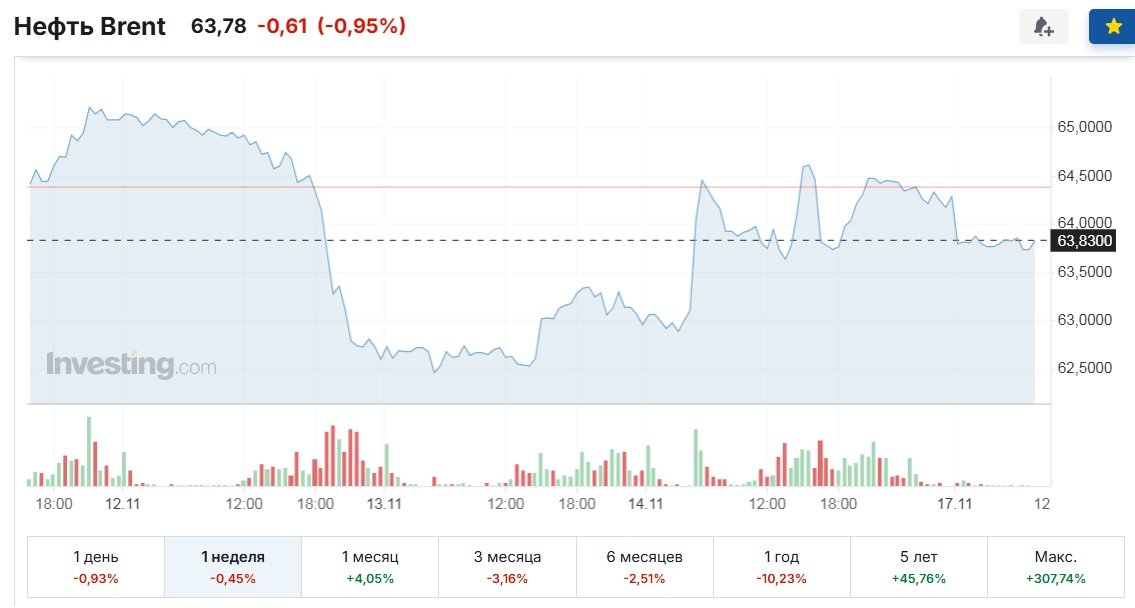 Котировки нефти снова пошли вниз. Баррель Brent подешевел почти на 1 % и торгуется на уровне 63,8 доллара. В пятницу цена подскочила до 64,4 доллара на фоне опасений по поводу поставок из России. Тогда рынок отреагировал на удар украинских дронов по объектам экспорта в Новороссийске. Однако уже в понедельник рост сменился коррекцией, несмотря на политические заявления из США.