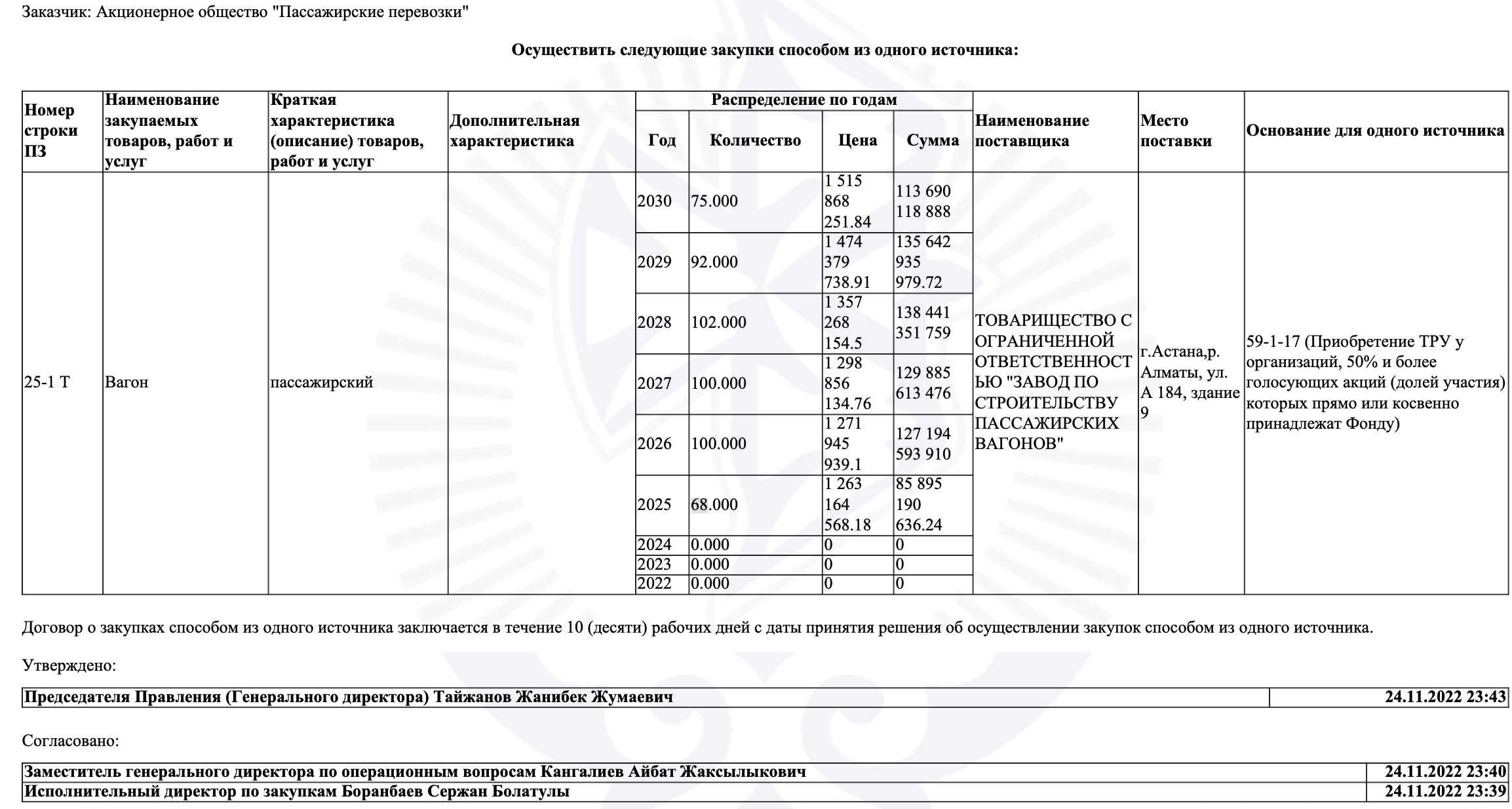 Также, по нашей информации, в 2023 году КТЖ выплатил заводу аванс порядка 147 млрд тенге, а в 2025 году за поставку 51 вагона — ещё 43,3 млрд.