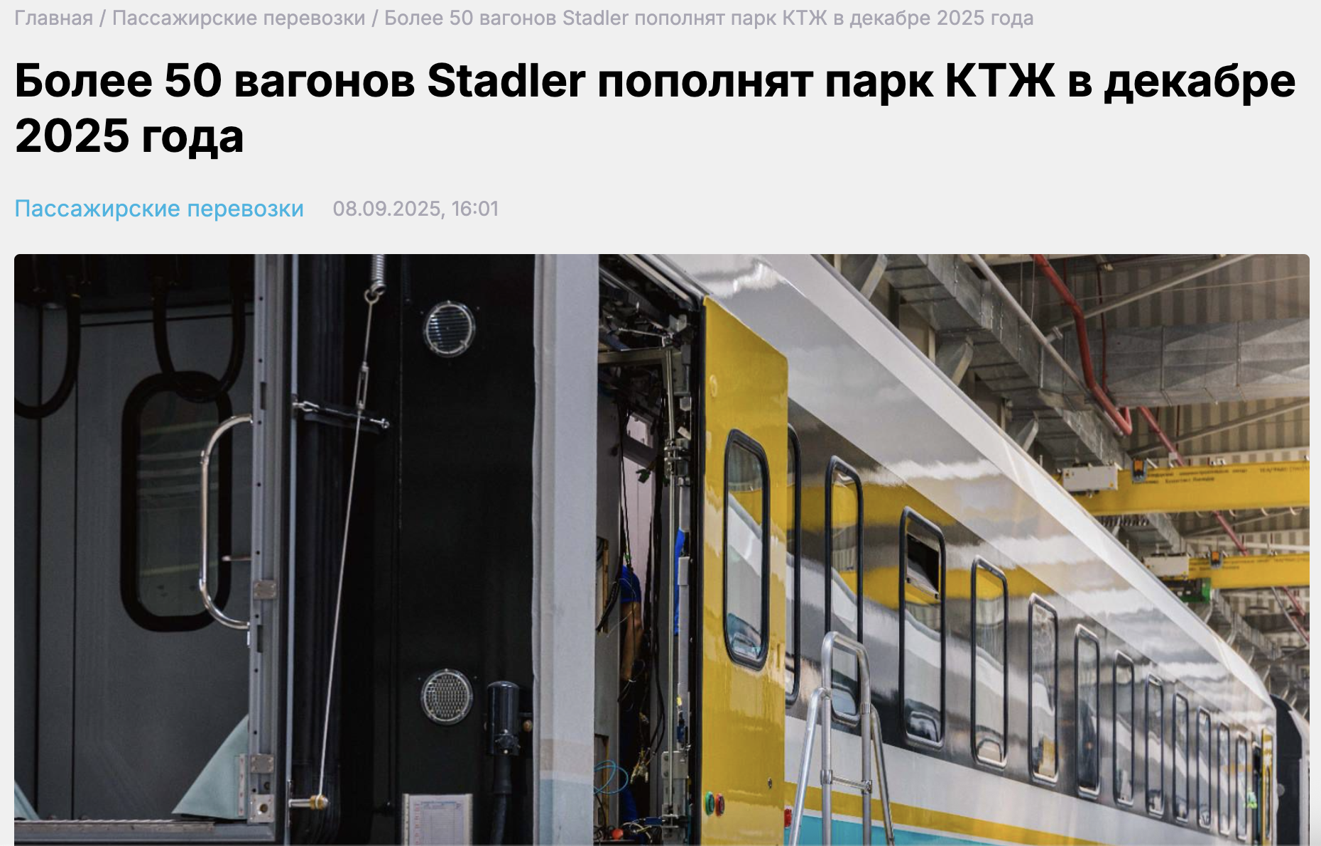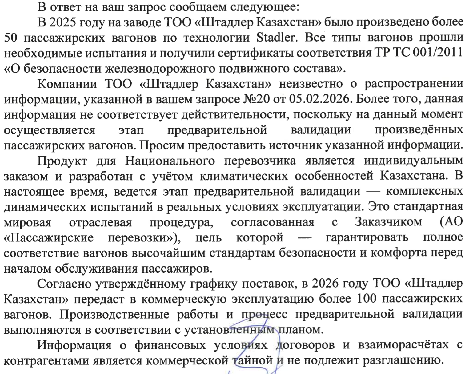 «В 2025 году на заводе Stadler Kazakhstan было произведено более 50 пассажирских вагонов по технологии Stadler. Все типы вагонов прошли необходимые испытания и получили сертификаты соответствия ТР ТС 001/2011 „О безопасности железнодорожного подвижного состава“. Компании неизвестно о распространении информации, указанной в вашем запросе. Более того, эта информация не соответствует действительности, поскольку на данный момент осуществляется этап предварительной валидации произведённых пассажирских вагонов»,