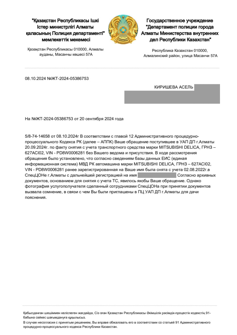 Асель вот уже больше полугода пытается вернуть свой автомобиль. В сентябре 2024 года она обратилась с заявлением о незаконном снятии с учёта и постановки на другого человека её Mitsubishi Delika в полицию Ауэзовского района, который перенаправил его в Алатауский район по месту совершения преступления.