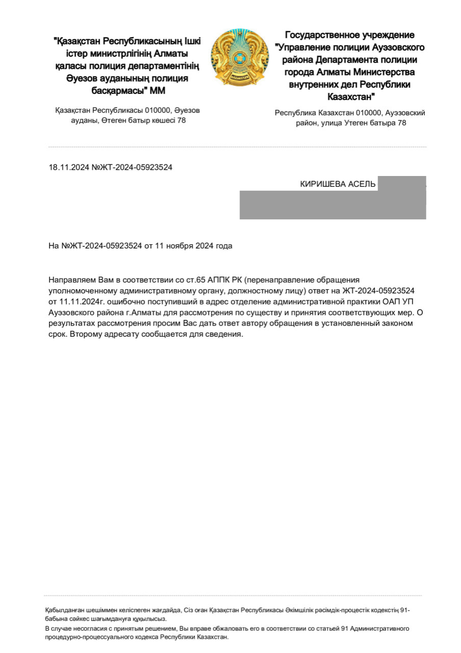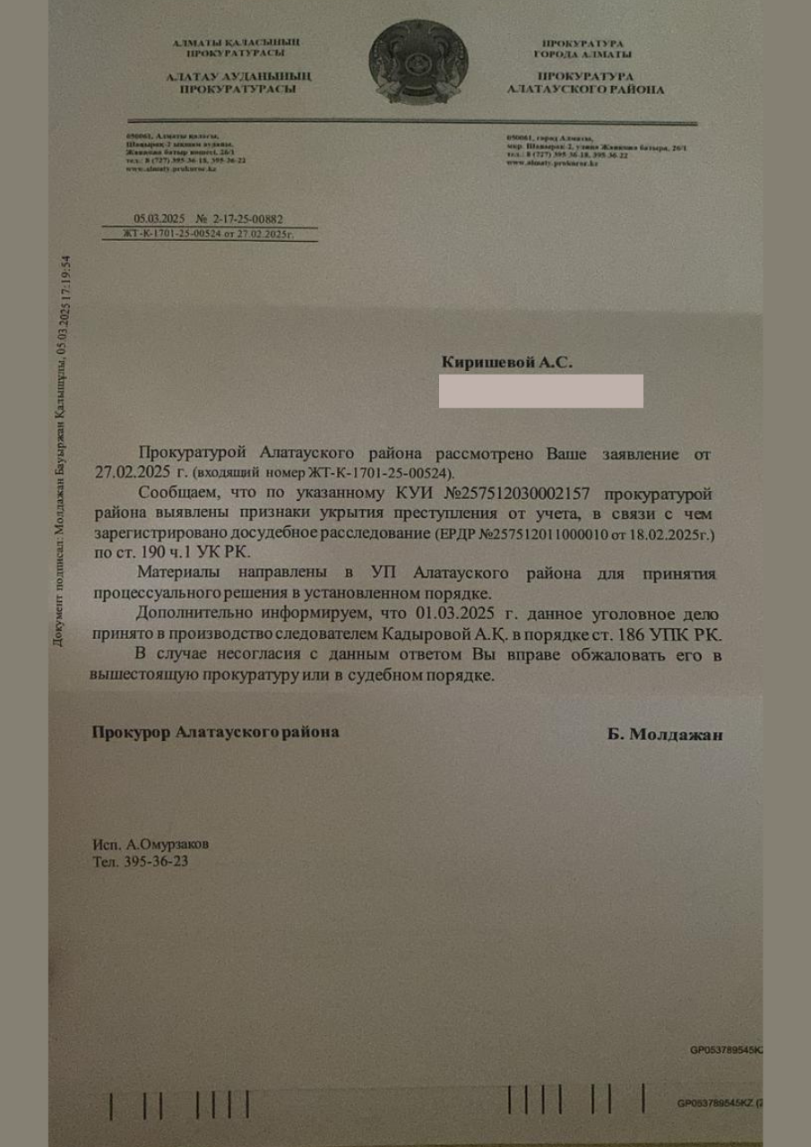 «С сентября 2024 года в Алатауском РОВД не приняли никаких мер. Такое ощущение, что они сами покрывали этих мошенников. Мне пришлось обратиться в прокуратуру района с жалобой»,рассказывает Асель.
