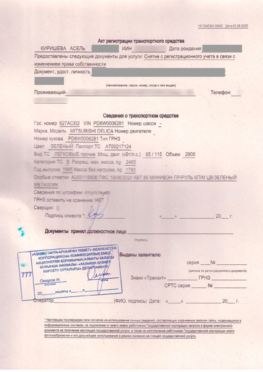 Асель вот уже больше полугода пытается вернуть свой автомобиль. В сентябре 2024 года она обратилась с заявлением о незаконном снятии с учёта и постановки на другого человека её Mitsubishi Delika в полицию Ауэзовского района, который перенаправил его в Алатауский район по месту совершения преступления.