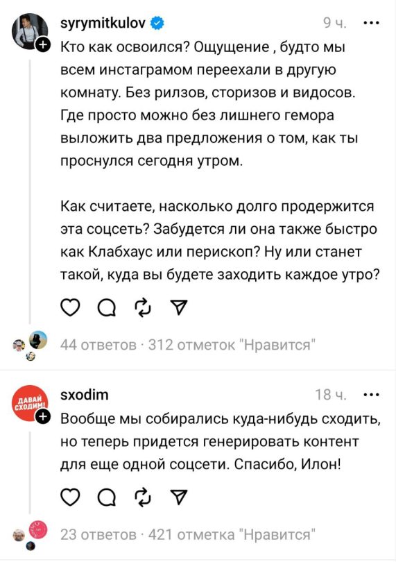 В соцсети уже можно увидеть страницы известных казахстанских личностей, СМИ, популярных блогеров. Например, Бейбит Алибеков считает, что Threads «это точная копия Твиттера от Меты Цукерберга». Он сравнил соцсеть с Клабхаусом, который так же громко открылся, но очень быстро сдулся, оставив своих пользователей ни с чем.