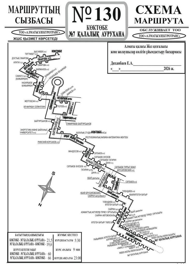 Маршрут № 130 будет ходить по такой схеме: городская больница № 7 — проспект Райымбека — улица Утеген батыра — проспект Абая — улица Сатпаева — улица Байтурсынова — проспект Сейфуллина — проспект Аль-Фараби — проспект Достык — конечный пункт «Кок-Тобе».