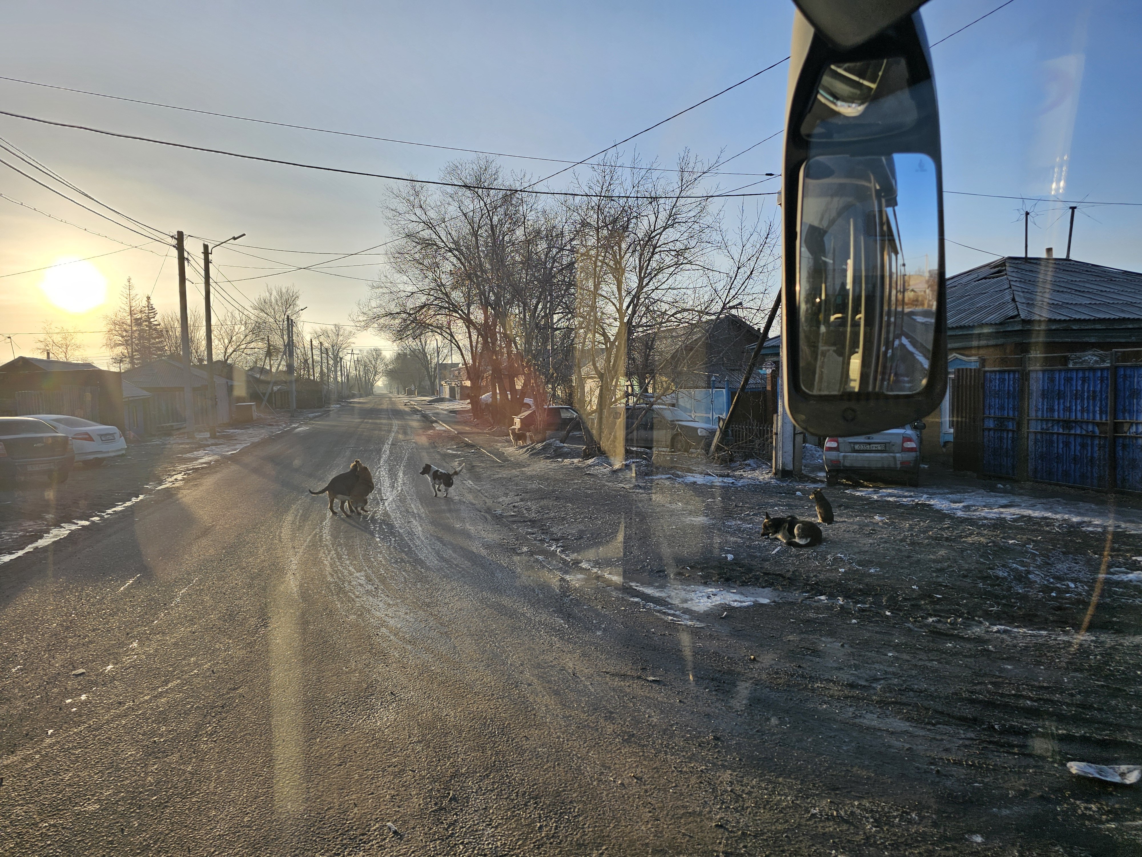 На асфальте прямо под колёсами автобуса дерутся непуганые собаки. Их здесь много. И они привыкли хозяйничать там, где почти не ездят автомобили.