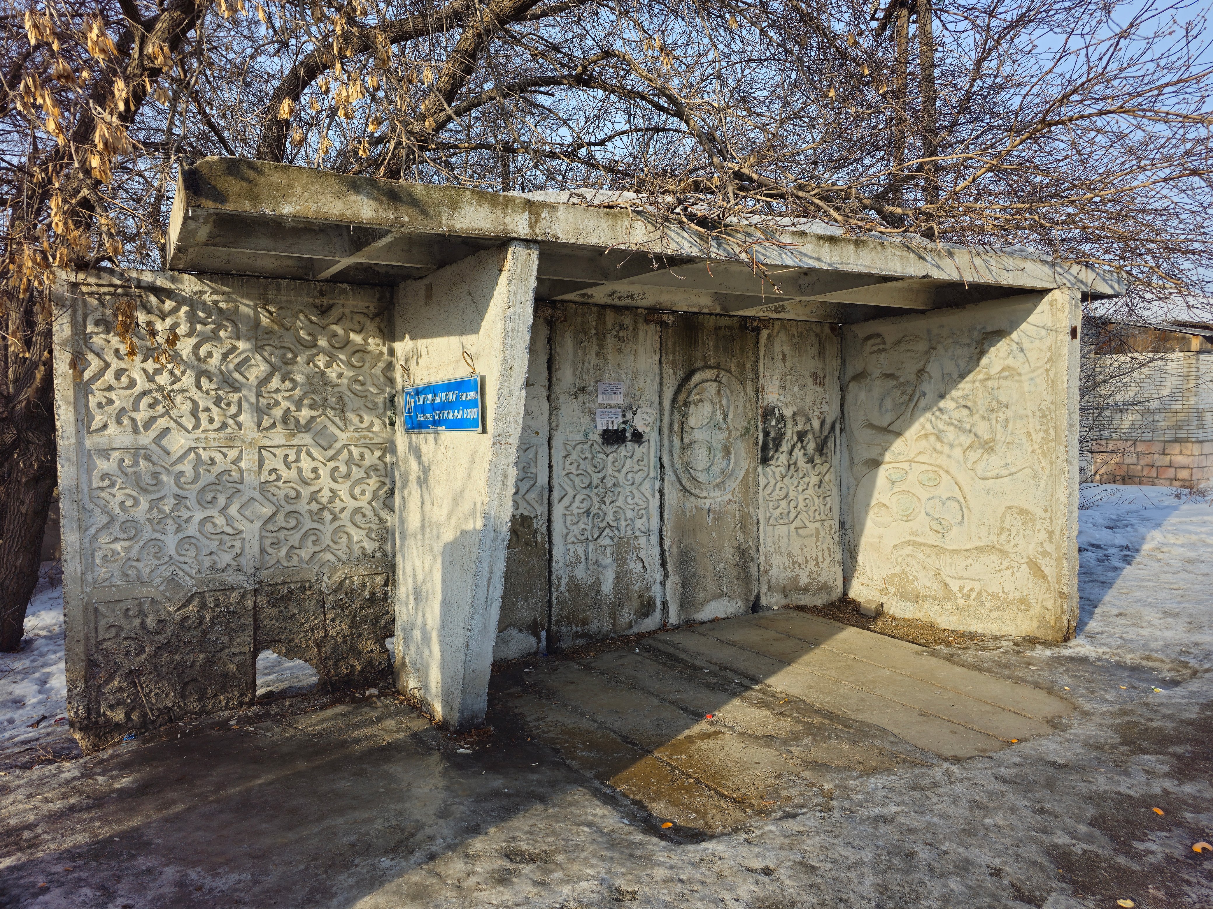 Помимо оригинально оформленной остановки, внимание здесь привлекает туалет. Я ещё помню, как много лет назад строительство этих туалетов на конечных остановках обсуждалось как серьёзное достижение городского акимата.