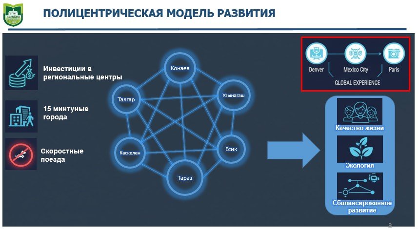 «Мы предлагаем создать сеть сильных, самодостаточных центров по всему региону. Они будут построены по принципу „15-минутного города“, где всё необходимое для жизни находится в шаговой доступности. И, что очень важно, эти центры будут связаны между собой сетью скоростного общественного транспорта»,подчеркнул Фараби Ермеков.