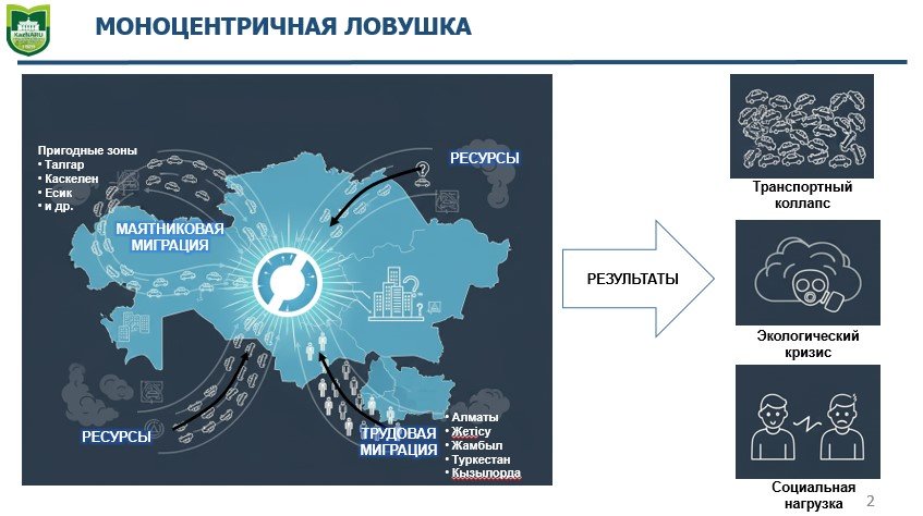 Алматы оказался в моноцентричной ловушке. Город как сверхмощный магнит притягивает к себе людей и ресурсы, что создаёт два разрушительных потока. Первый — трудовая миграция из южных и юго-восточных регионов страны. Это даёт колоссальную нагрузку на социальную инфраструктуру города.