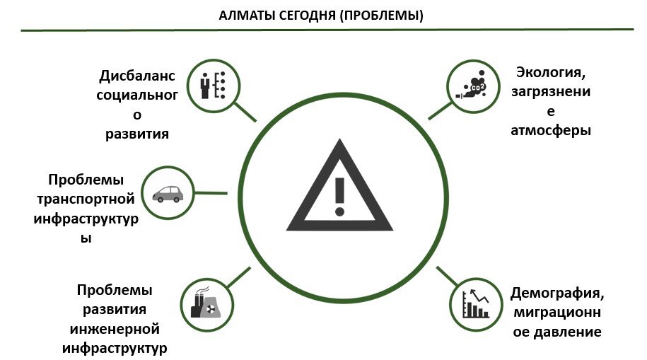 Второй — маятниковая миграция: из-за высокой стоимости жилья в городе люди вынуждены селиться в пригородах и каждый день устремляются на работу в город, что приводит к огромным пробкам и густому смогу. Алматы — город, который задыхается от собственного успеха. Решение — переход от моноцентричной к полицентричной модели.
