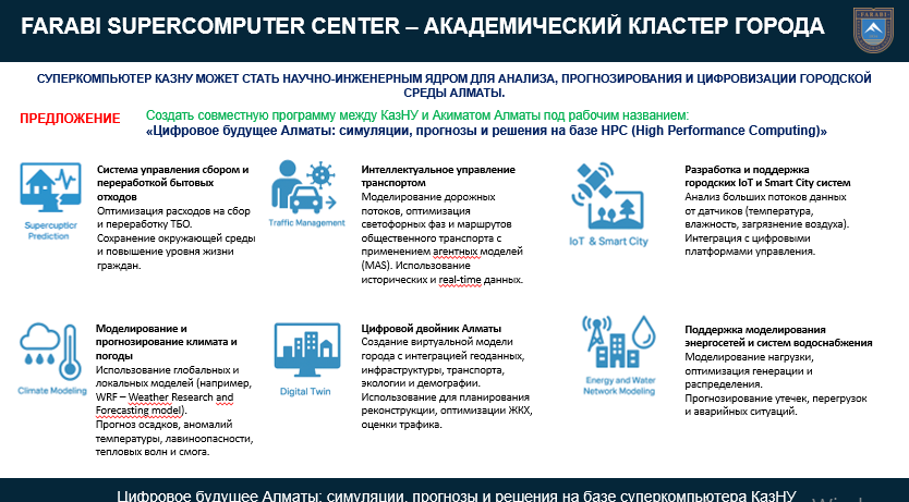 Второе — создание мощной цифровой экосистемы, которая могла бы включить в себя суперкомпьютер КазНУ. Основой станет региональный цифровой двойник, который будет собирать данные не только по всему Алматы, но и по всей агломерации.
