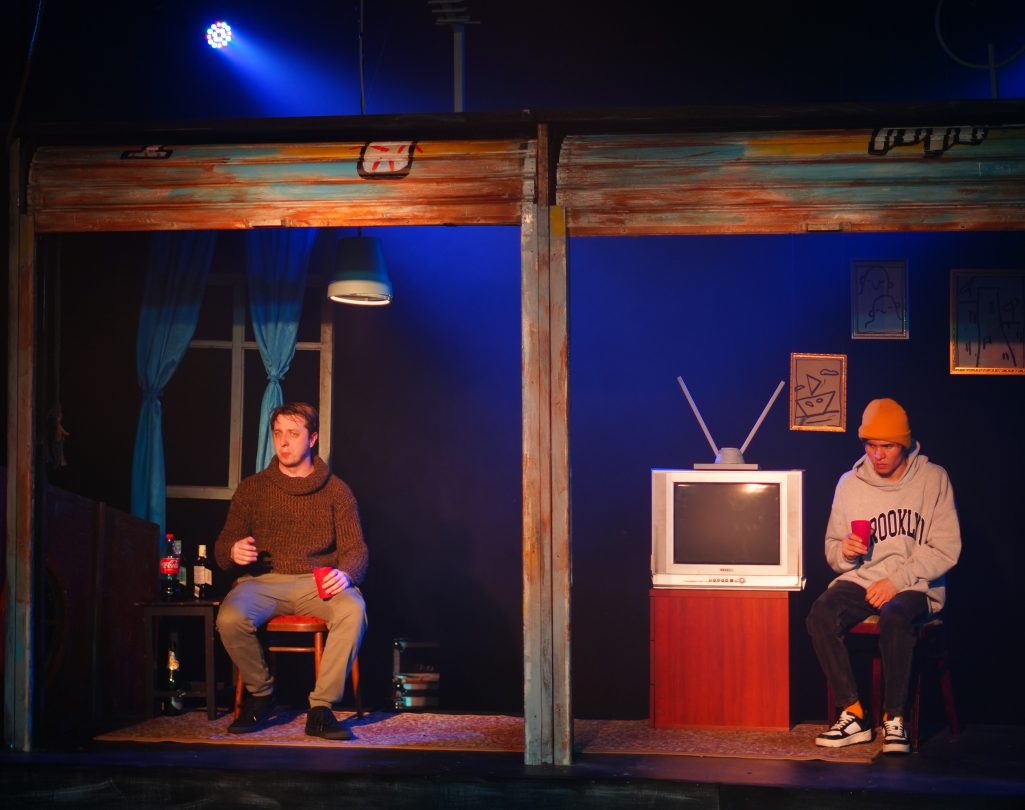 Привлекательно и сценическое решение. Помимо передвижного бункера на колесиках, вся декорация представлена четырьмя железными занавесами, раскрашенными на манер дворовых гаражей. В зависимости от того, где и как происходит действие, герои поднимают занавесы и оказываются в комнатах.