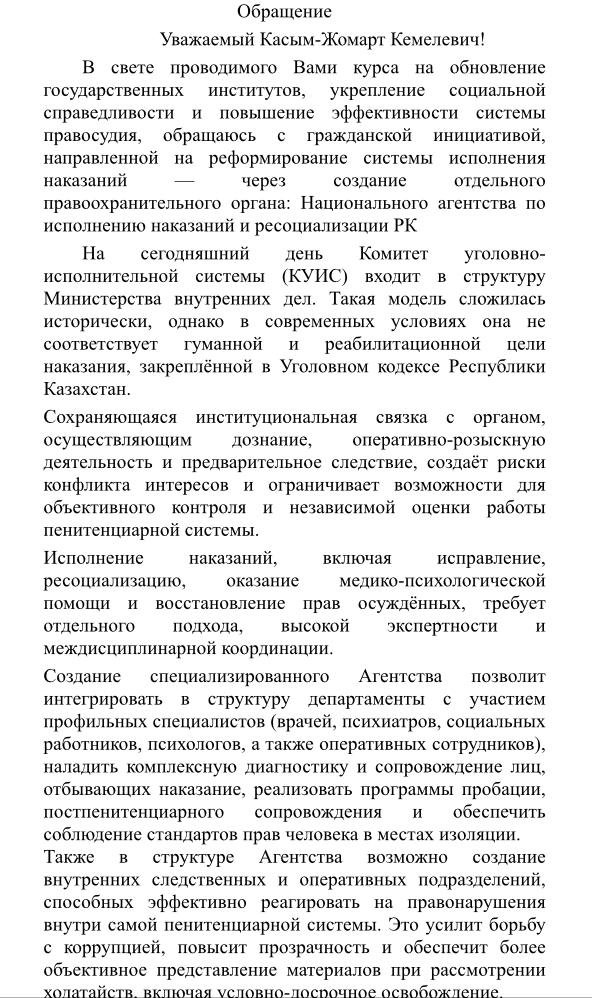 «Сегодня назрела необходимость в серьёзном реформировании УИС. Она должна быть направлена на перевоспитание осуждённых, а не просто их изоляцию от общества», — отметил Токаев.