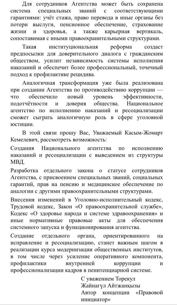 Посыл президента подхватила астанинский правозащитник и юрист с 30-летним стажем Жайнагуль Торекул. Она предлагает реформировать Комитет уголовно-исполнительной системы (КУИС), выведя его из состава МВД и сделав самостоятельным правоохранительным органом. Торекул предлагает назвать новое ведомство Национальным агентством по исполнению наказаний и ресоциализации.