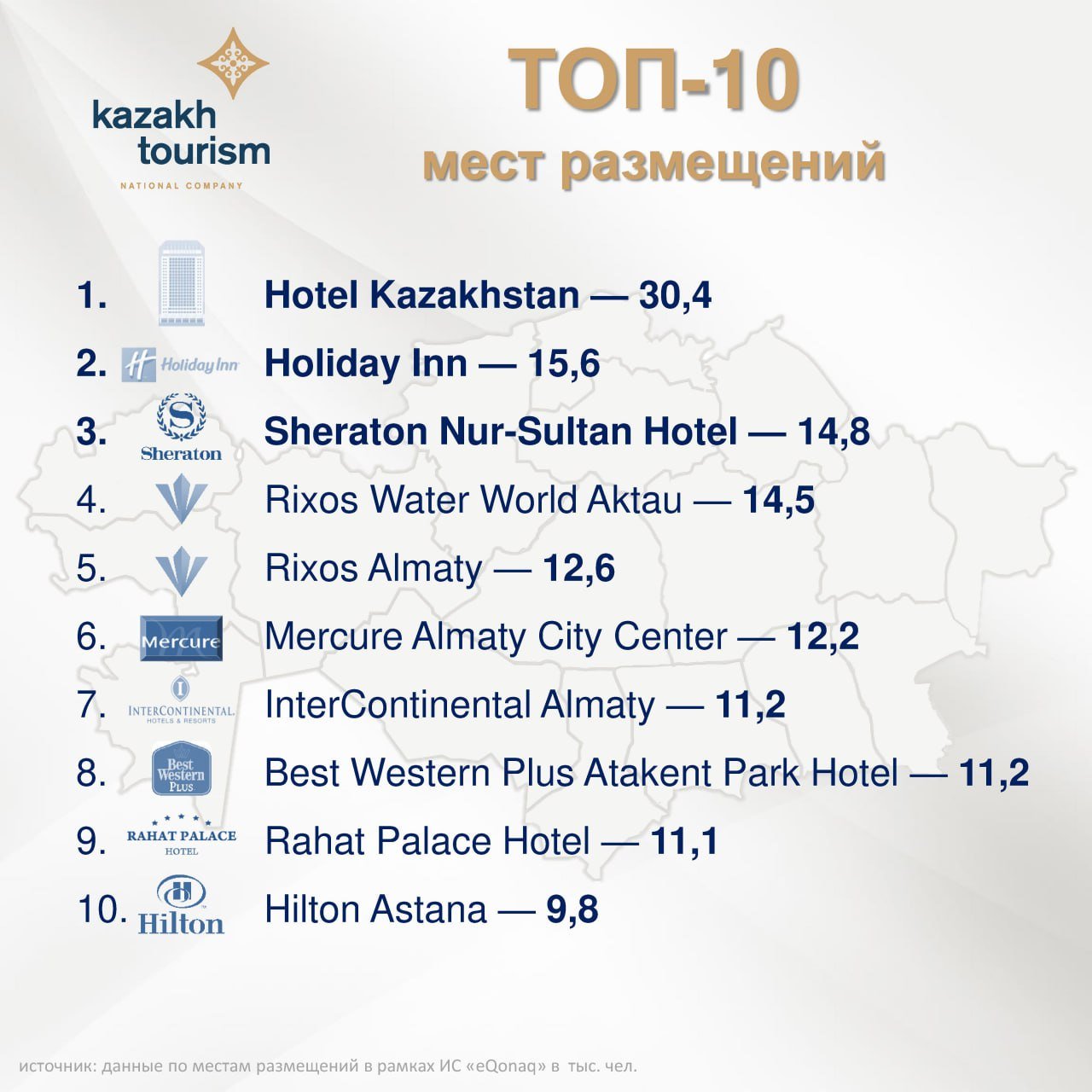 В Kazakh Tourism опубликовали рейтинг отелей Казахстана по посещению туристами. Первые две позиции заняли алматинские гостиницы «Казахстан» и Holiday Inn. На третьем месте расположился астанинский Sheraton Nur-Sultan Hotel.