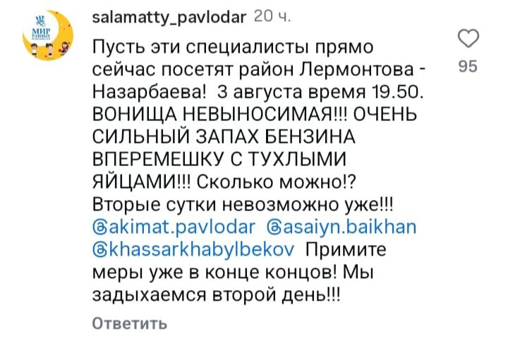 Кто-то говорит, что в городе воняет бензином, а кому-то запах напоминает тухлые яйца. Журналисту «Орды» из Павлодара, например, зловоние напоминает газ. Каждый по разному воспринимает учуянное, только мысль у всех одна — это не нормально.
