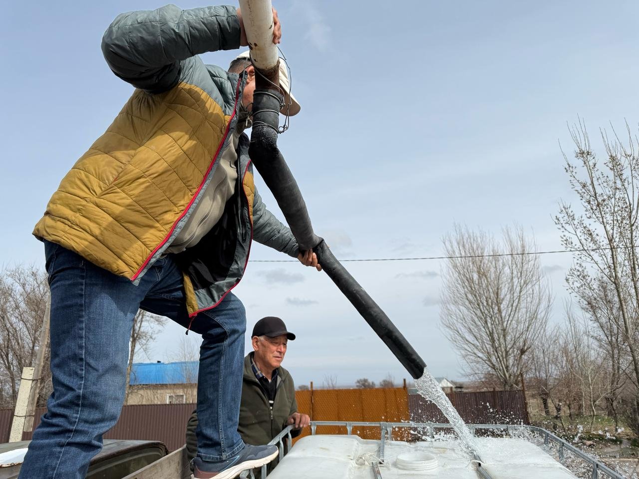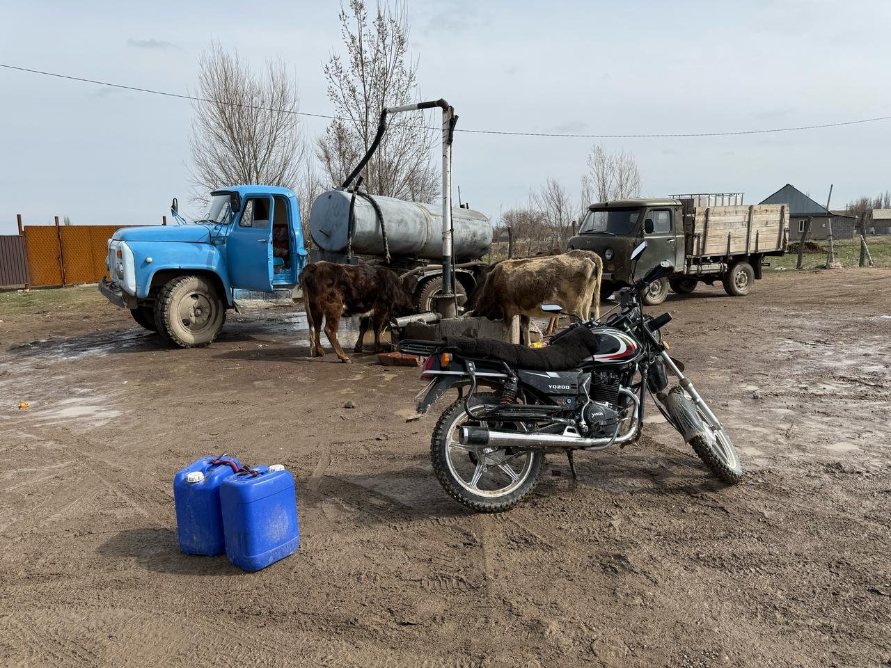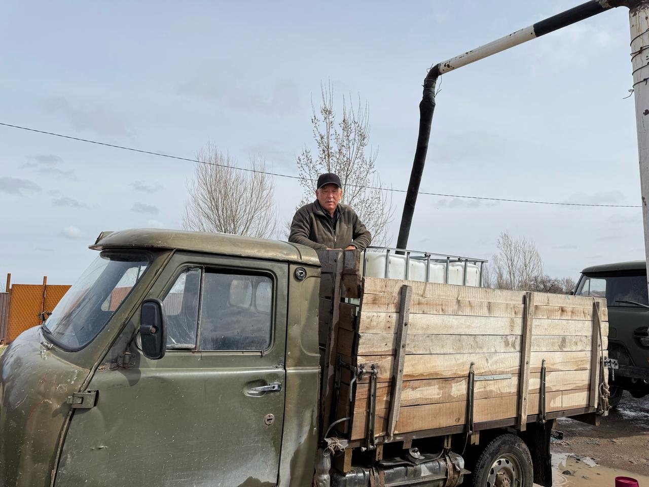 После беседы с нами местный водовоз закрыл заполненную ёмкость и, как и каждый день, отправился в дорогу. Следом другой водовоз, Бакытжан Ахатбакиев, стал наполнять свои ёмкости, установленные на тележке старенького «УАЗика».