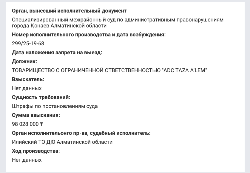 ТОО «ADC TAZA A’LEM» — непростая компания. Специализированный межрайонный суд по административным правонарушениям города Қонаева Алматинской области пытается взыскать 98 млн тенге с ТОО (окончательный статус по делу не определён).