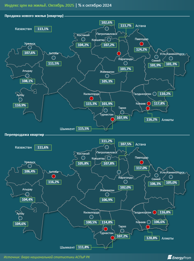 Больше всего новое жильё подорожало в Павлодаре — на 24,2 %. Далее идут Конаев (17,8 %), Алматы (16,2 %), Шымкент (15,5 %), Кызылорда (15,3 %) и Астана (13,7 %). Эти города показали рост выше среднего по стране. В остальных 14 динамика была слабее, а в шести городах — менее пяти процентов.