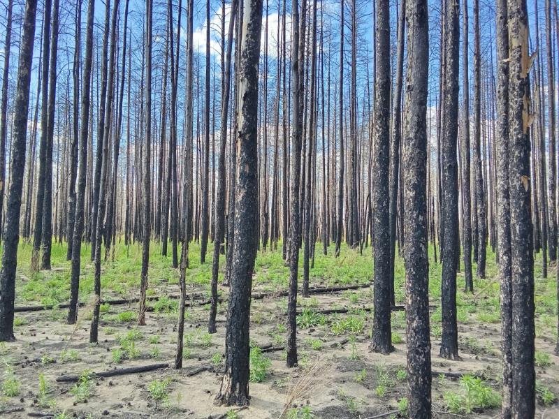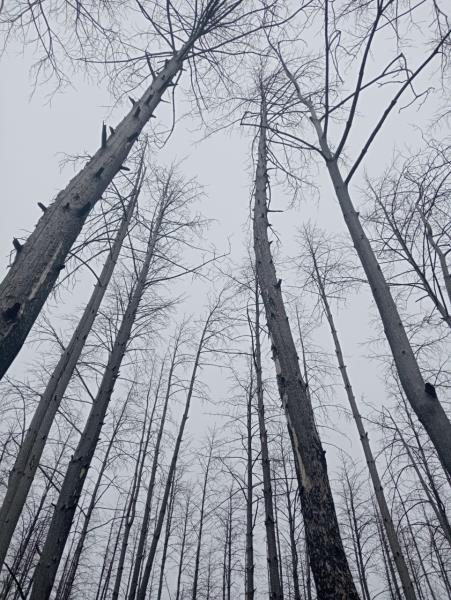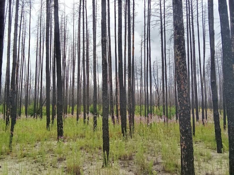 Фото с места продажи леса из-за плотного расположения сгоревших стволов как будто снимали с каким-то оптическим искажением. Можно подумать, что это кадр из нового фильма про постапокалипсис.
