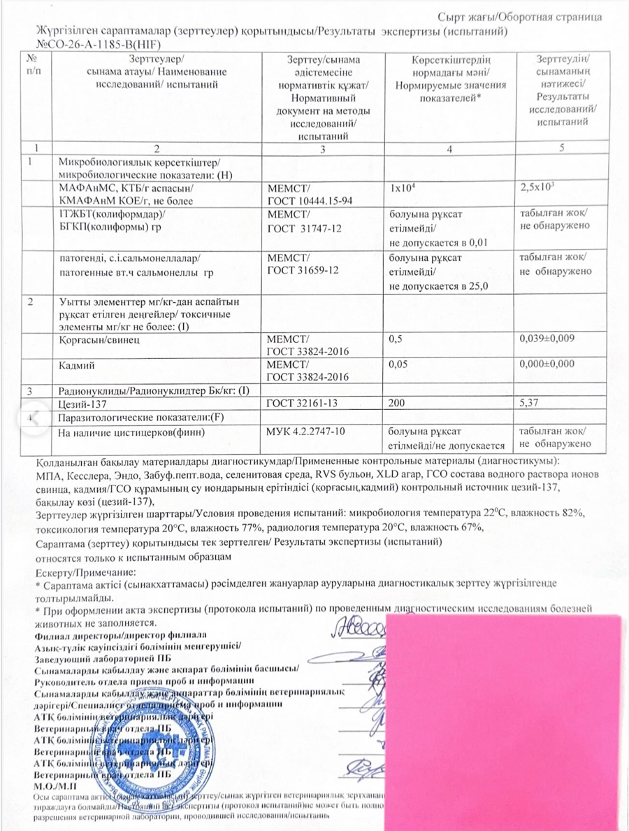 Также специалисты исследовали продукт на радионуклиды. Концентрация цезия оказалась в 37 раз ниже предельно допустимого уровня. Паразитологическая экспертиза не выявила цистицерков — паразитов, которые могут встречаться в мясе.