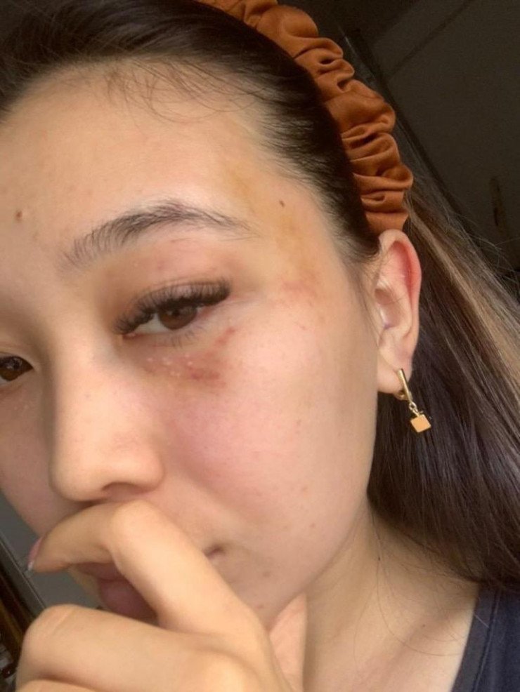 «Я сидела в темноте. Он нашёл меня, затащил обратно в зал. Бил по голове, тянул за волосы. Последнее, что я помню, — как он душил меня. Потом я уже очнулась на улице, лёжа на земле. Надо мной стояли он и его друг. Он спрашивал: „Зачем ты спрыгнула?“ Я не понимала, о чём он говорит. Просила помочь», рассказывает пострадавшая.