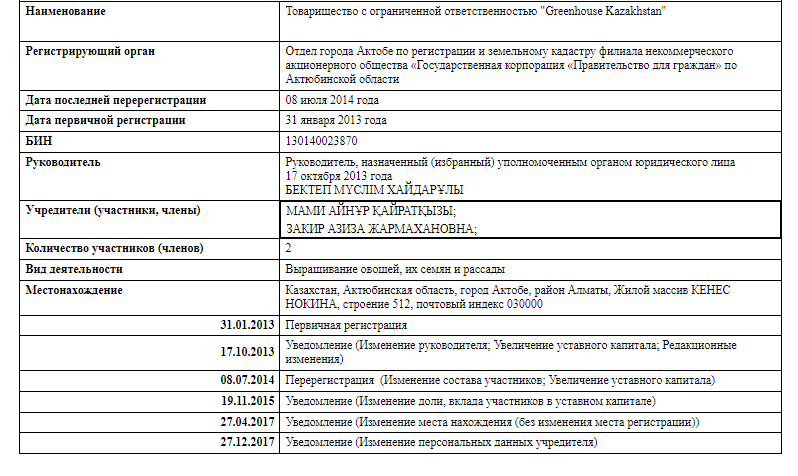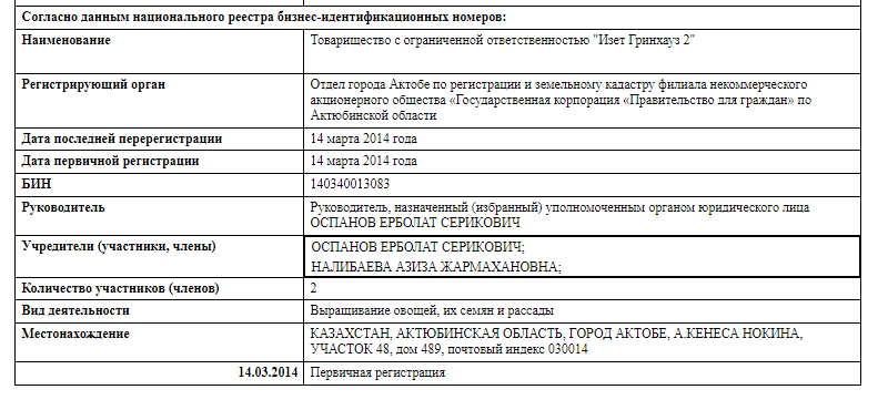 В марте 2014 года в Казахстане появилась компания "Изет Гринхауз 2". Предприятие специализируется на выращивание овощей, их семян и рассады. Как и её одноименное ТОО, расположено в городе Актобе. Организация не может похвастать большими налоговыми отчислениями. Последний платёж в казну государства датируется 2020 годом и составляет всего 650 тенге. Но интересно тут другое – учредители и директор.