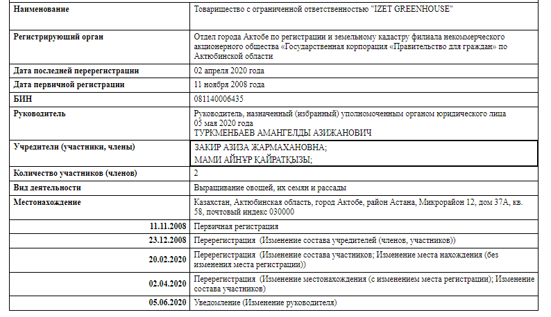 Учредителями сельскохозяйственной компании Izet Greenhouse выступают всё те же Айнур Мами и Азиза Закир, а вот директором они назначили Амангельды Туркменбаева.