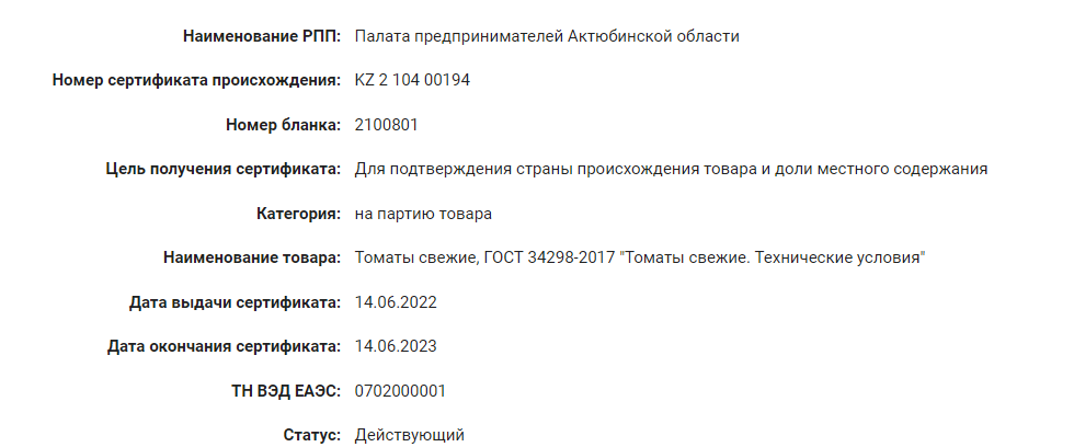 14 июня 2022 года предприятие получило сертификат на ещё одну партию помидоров. Единая товарная номенклатура внешнеэкономической деятельности Евразийского экономического союза (ТН ВЭД ЕАЭС) нужна была для подтверждения страны происхождения овощей и доли местного содержания.