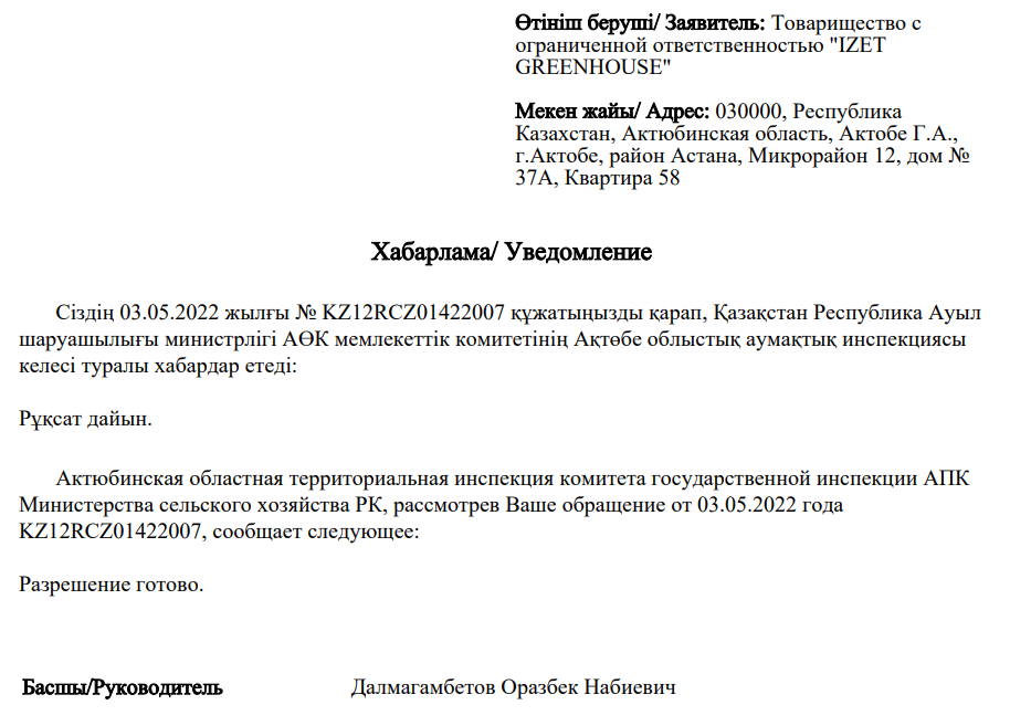 Чтобы вывезти томаты за пределы Казахстана, обе организации получили по 100 лицензий каждая. ТОО «Izet Greenhouse» стало оформлять фитосанитарные сертификаты на вывоз подкарантинной продукции с 3 апреля 2022 года. Последний компания получила в начале ноября 2022 года. Большинство лицензий на сегодня недействительны.