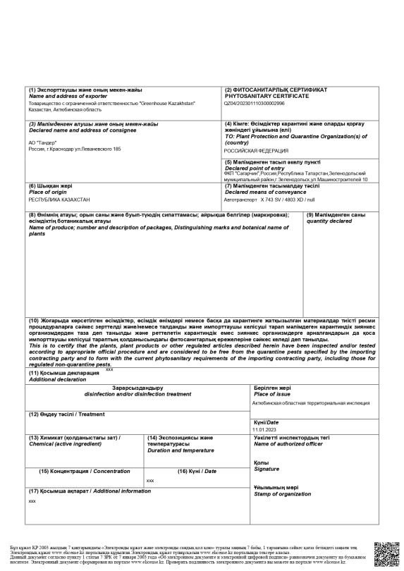 В феврале 2022 года Greenhouse Kazakhstan получил сертификат соответствия техрегламентам Евразийского экономического союза (ТР ЕАЭС). Официальный документ подтвердил, что овощи соответствуют всем обязательным требованиям качества и безопасности, установленным в Технических регламентах. Выдали сертификат на продажу 10 сортов томатов.