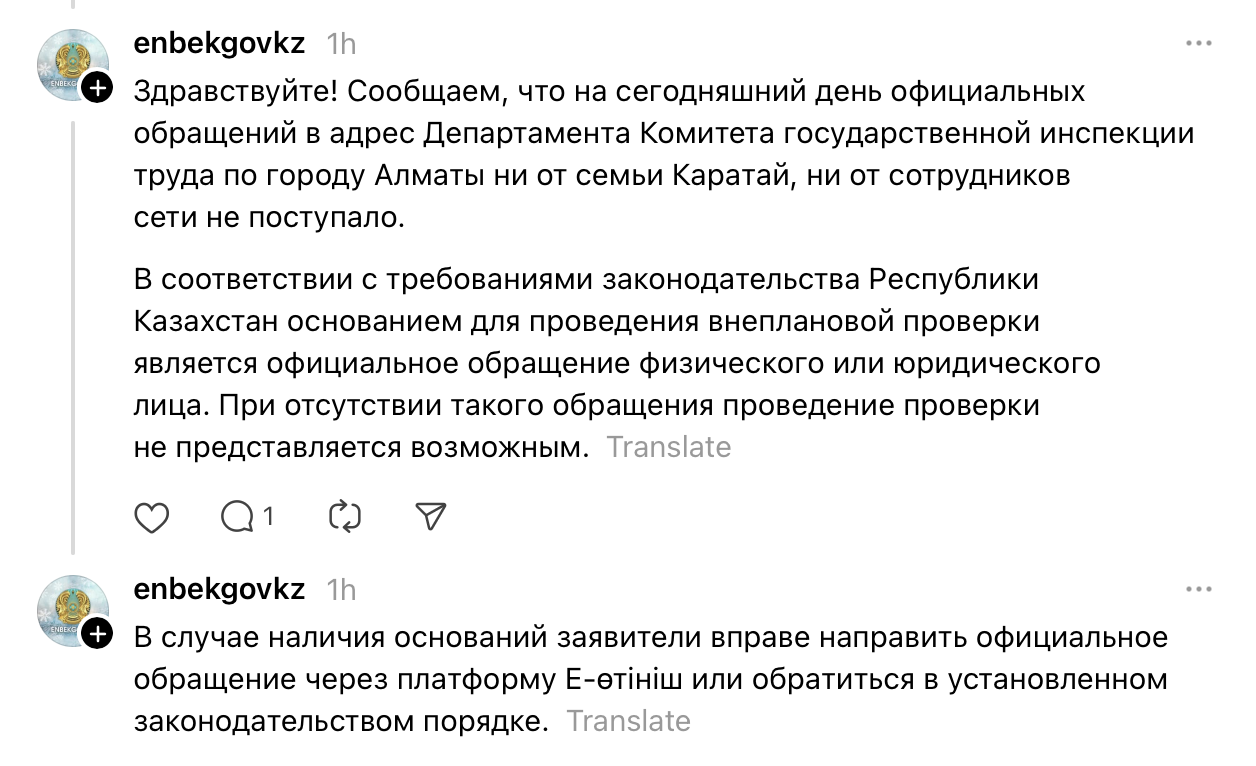 На своей странице в Threads мать Алибека Жанат Каратай опубликовала сообщения, которые, по её словам, прислали сотрудники. В них говорится, что руководство заставляет писать объяснительные о том, что Алибек якобы «опасен для общества».