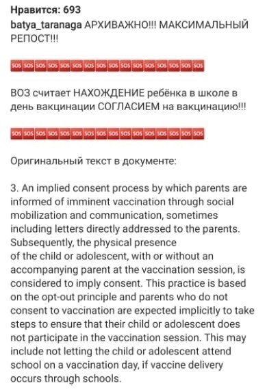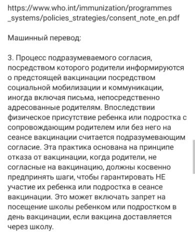 Заголовок абзаца, из которого вырвана цитата в рассылаемом посте, гласит: «Распространенные подходы к получению согласия на вакцинацию». Далее в тексте описываются стандарты получения письменного, устного и подразумеваемого согласия, действующие в разных странах.
