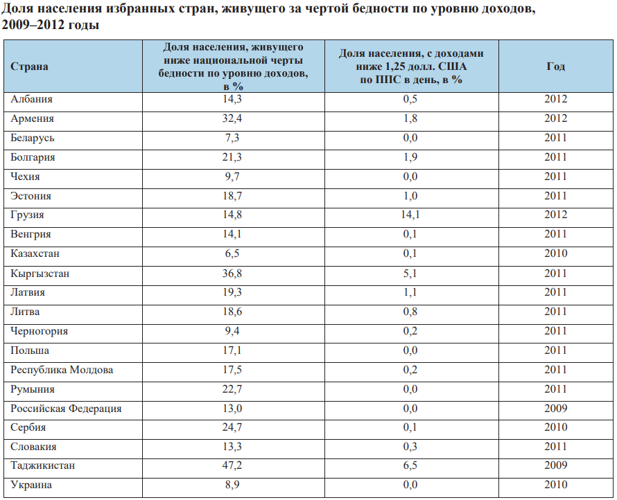Статистика Европейской экономической комиссии (ЕЭК) ООН показывает, что бедность можно считать по-разному. Данные тоже будут различаться в силу того, что у каждой методики своя шкала и свой уровень бедности. Национальная черта бедности отражает принятый в каждой стране минимальный уровень доходов для жизни. В международной практике долгое время было принято ориентироваться на планку $1,25 по паритету покупательной способности (ППС) в день. Считалось, что доходы ниже неё соответствуют самому крайнему уровню нищеты, что позволяет сравнивать страны между собой.