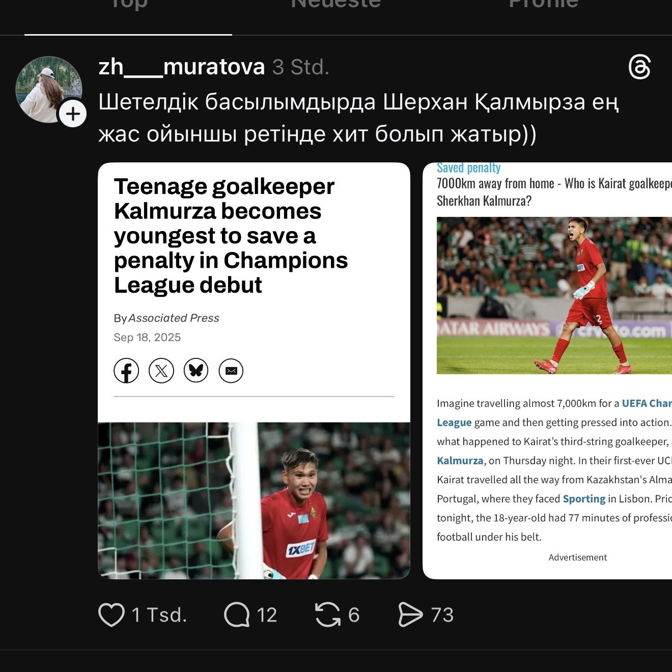 Казахстанские болельщики на этой неделе почувствовали настоящую национальную гордость. 18-летний вратарь Шерхан Калмурза в дебютном матче Лиги чемпионов против лиссабонского «Спортинга» установил рекорд. Как пишет Associated Press, он стал самым молодым голкипером, отразившим пенальти в дебютном матче Лиги чемпионов.