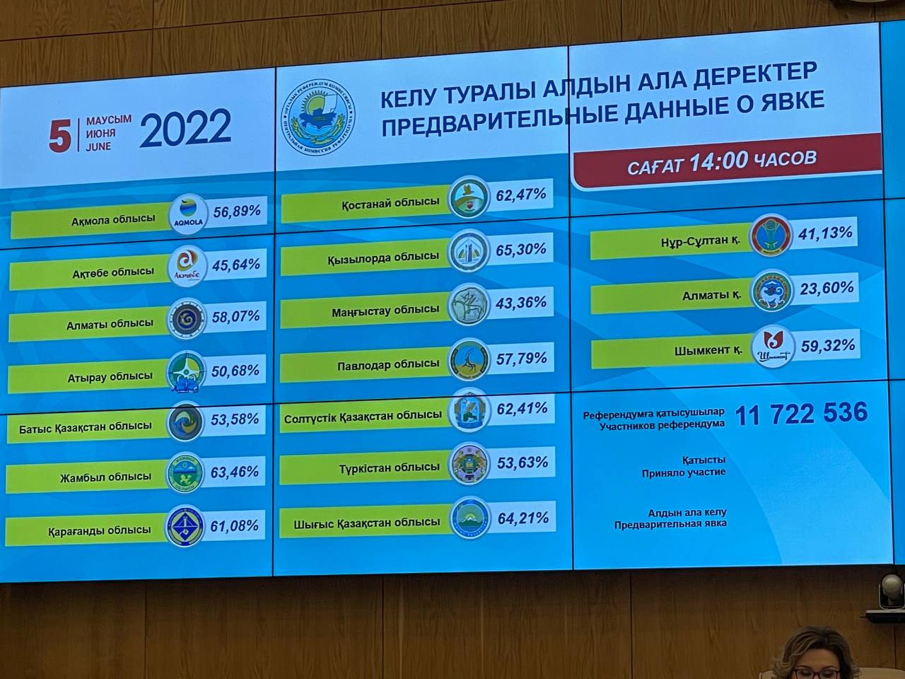 По данным территориальных комиссий референдума на 14:00, установленный порог явки достигнут. Всего проголосовали 53,43% казахстанцев. Самыми активными оказались жители Кызылординской области – 65,30%, а самую низкую явку зафиксировали в Алматы – 23,60%.