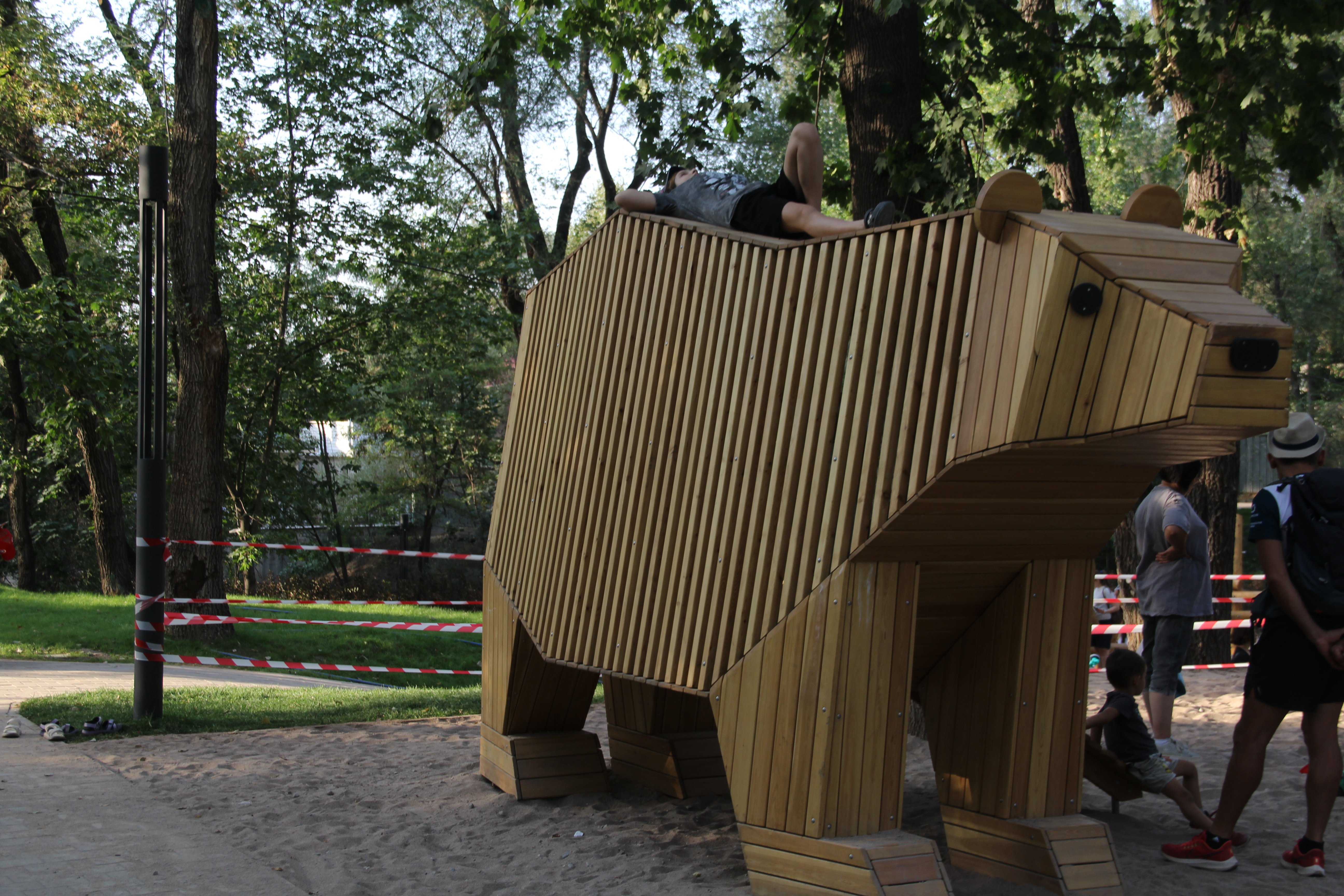 Рядом с прудом сделали спортивную площадку. А чуть ниже — сразу две детских. С вот таким медведем!