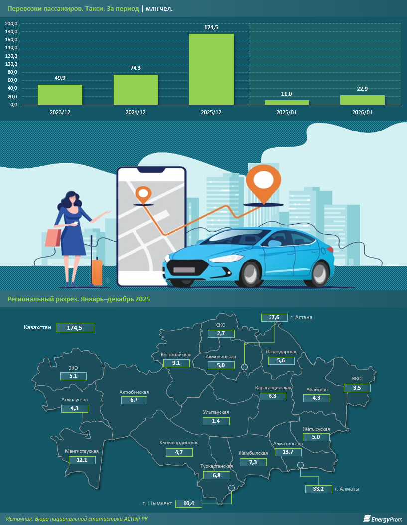 Больше всего такси вызывают в Алматы и Астане. На эти два города приходится более трети всех поездок по стране. Лидирует Алматы — 33,2 млн пассажиров за год. Астана на втором месте — 27,6 млн. Высокий спрос также в Алматинской области — 13,7 млн поездок, в Мангистауской — 12,1 млн, и в Шымкенте — 10,4 млн.