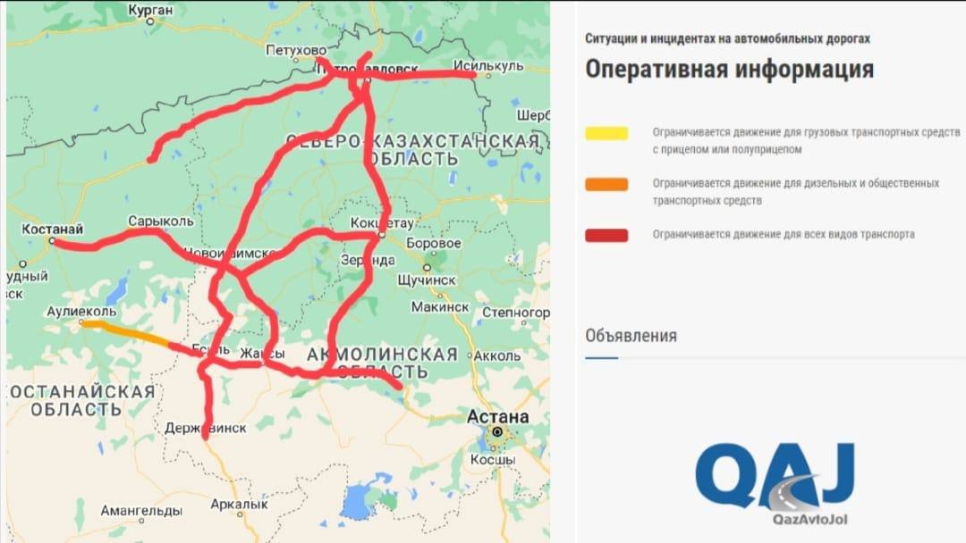 Всего же по стране ограничения действуют на 22 участках автодорог республиканского значения: девять — в Акмолинской области, пять — в Костанайской и восемь — в СКО.