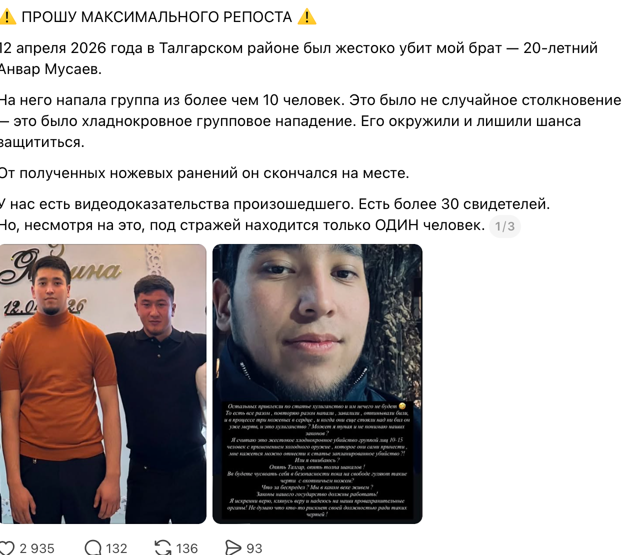 По словам автора поста, 12 апреля на молодого человека напали более 10 человек. От полученных ножевых ранений он скончался на месте.