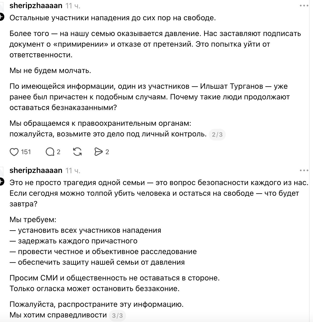 Также родственники заявляют о давлении: по их словам, их пытаются убедить подписать отказ от претензий. Они требуют установить всех участников нападения, задержать причастных и провести объективное расследование.