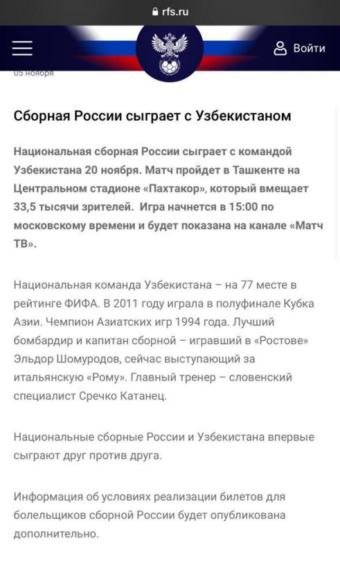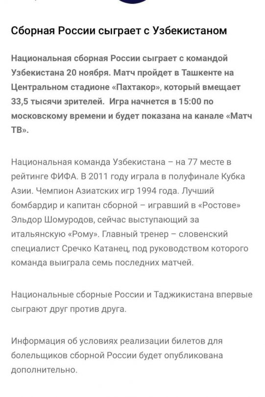 20 ноября национальная сборная России по футболу сыграет с командой Узбекистана. Матч пройдёт в Ташкенте на Центральном стадионе «Пахтакор». Сборные впервые сыграют друг против друга. Эту новость опубликовал у себя Российский футбольный союз, допустив ошибку.