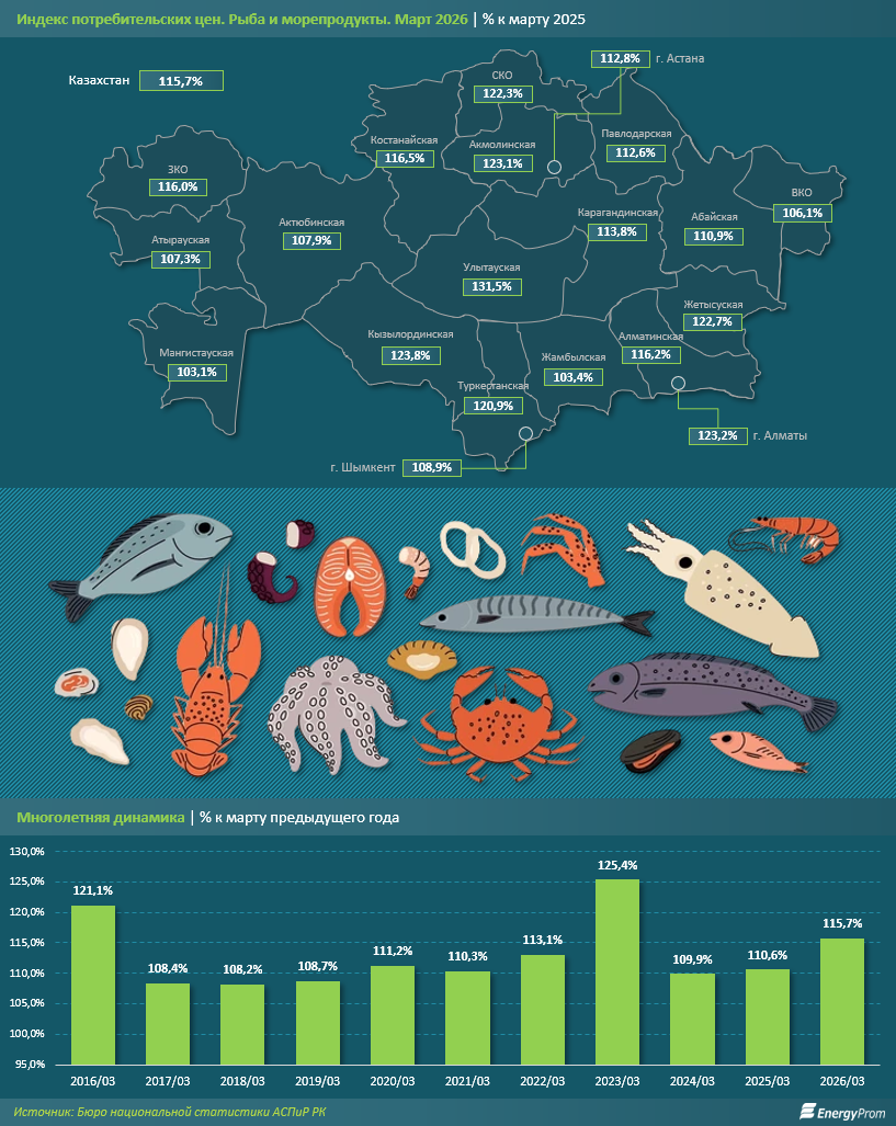 С начала 2026 года в Казахстане зафиксировали значительный рост цен на рыбу и морепродукты. Показатель стал одним из самых заметных за последнее десятилетие. При этом в стране увеличилось и собственное производство продукции, сообщает Orda.kz со ссылкой на аналитиков Energyprom.kz.