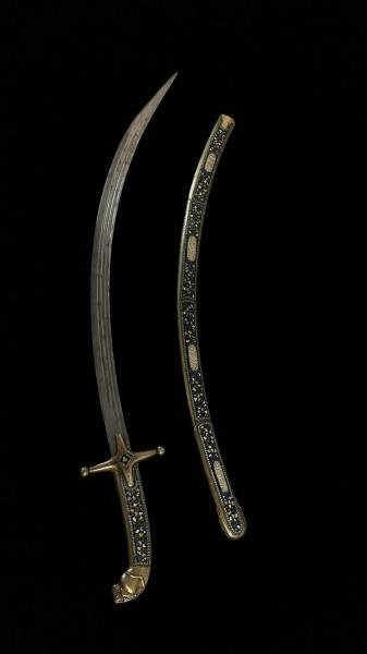Сабля в ножнах с цветной эмалью и костяными вставками ушла с молотка по стартовой цене — 385,2 тыс. тенге. Это редкий экземпляр: клинок из стали, ножны и рукоять богато украшены.
