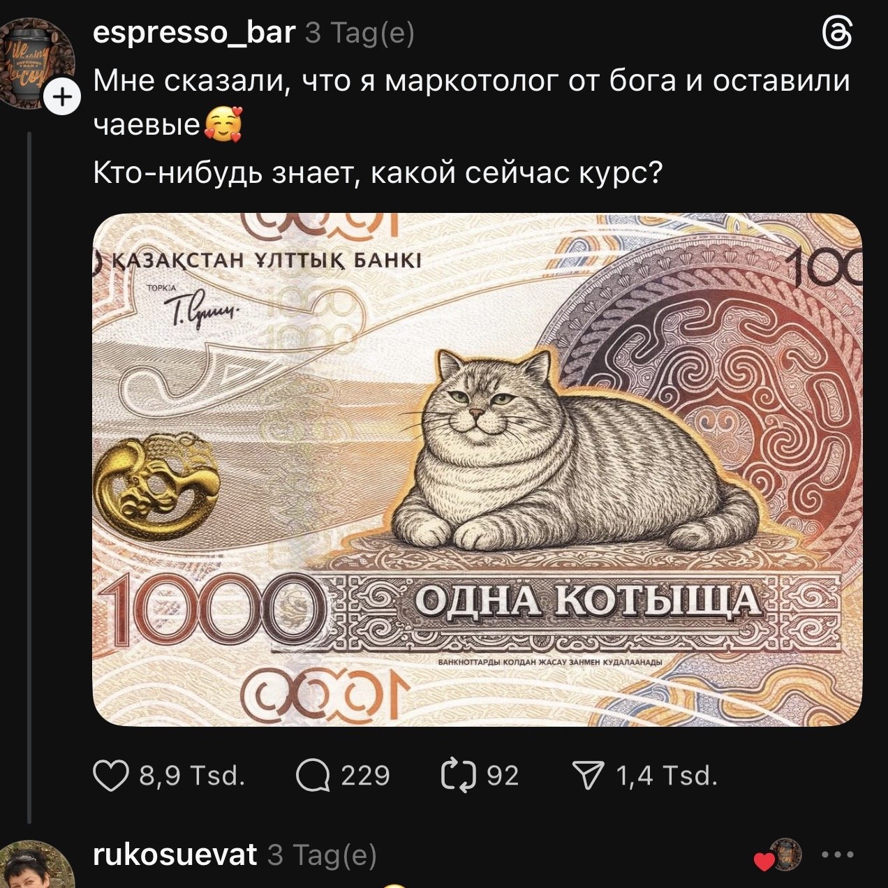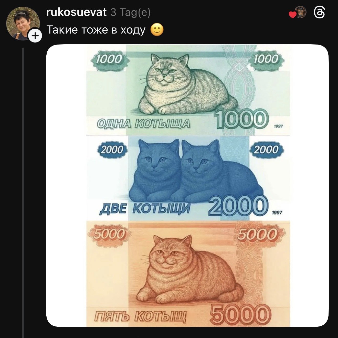 Иллюстрация банкноты с изображением упитанного кота разлетелась по Threads и Instagram, превратившись из шутки в почти политическую инициативу. Пользователи начали предлагать реально ввести такую купюру в обращение — вплоть до идеи создать петицию.