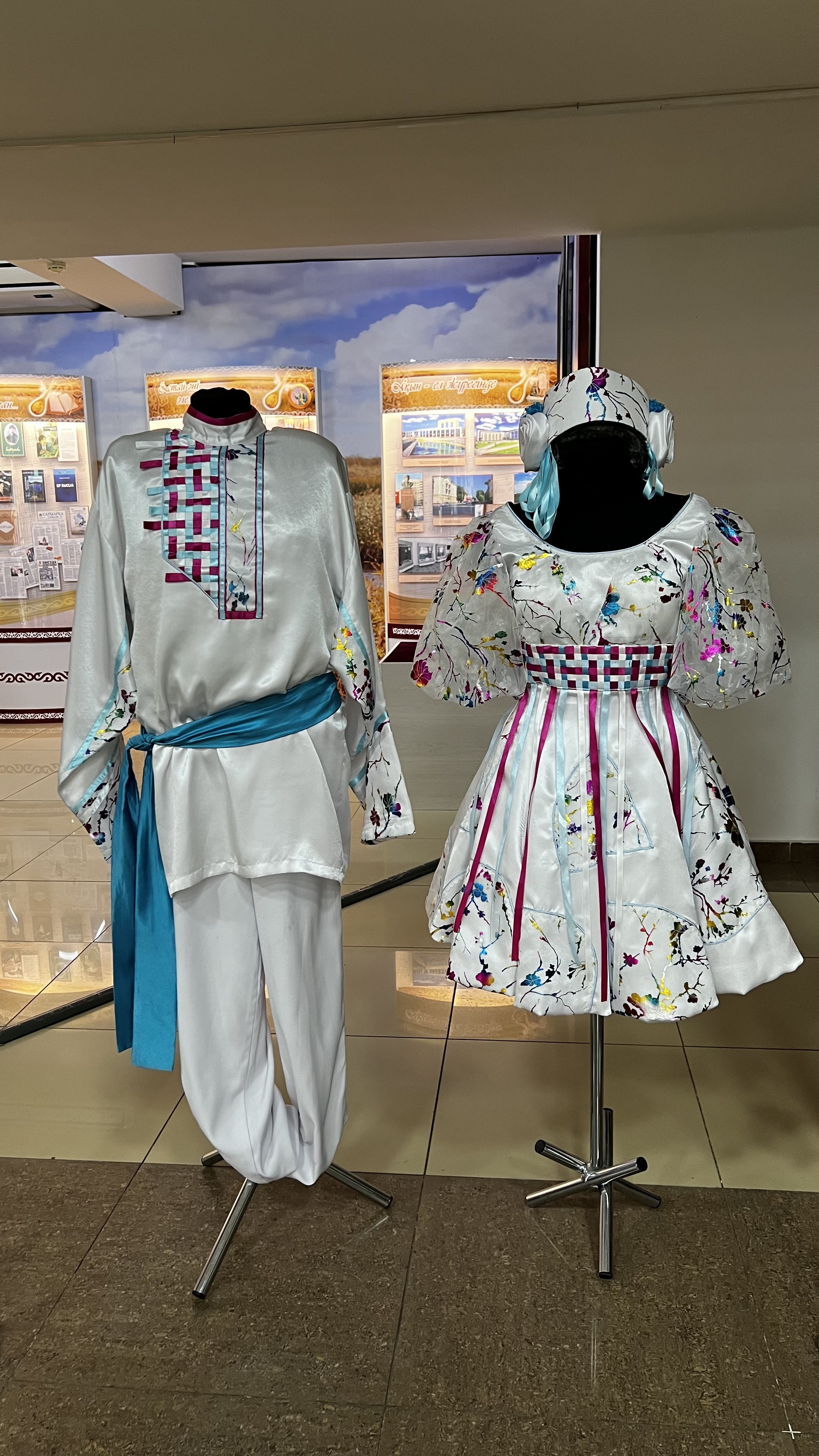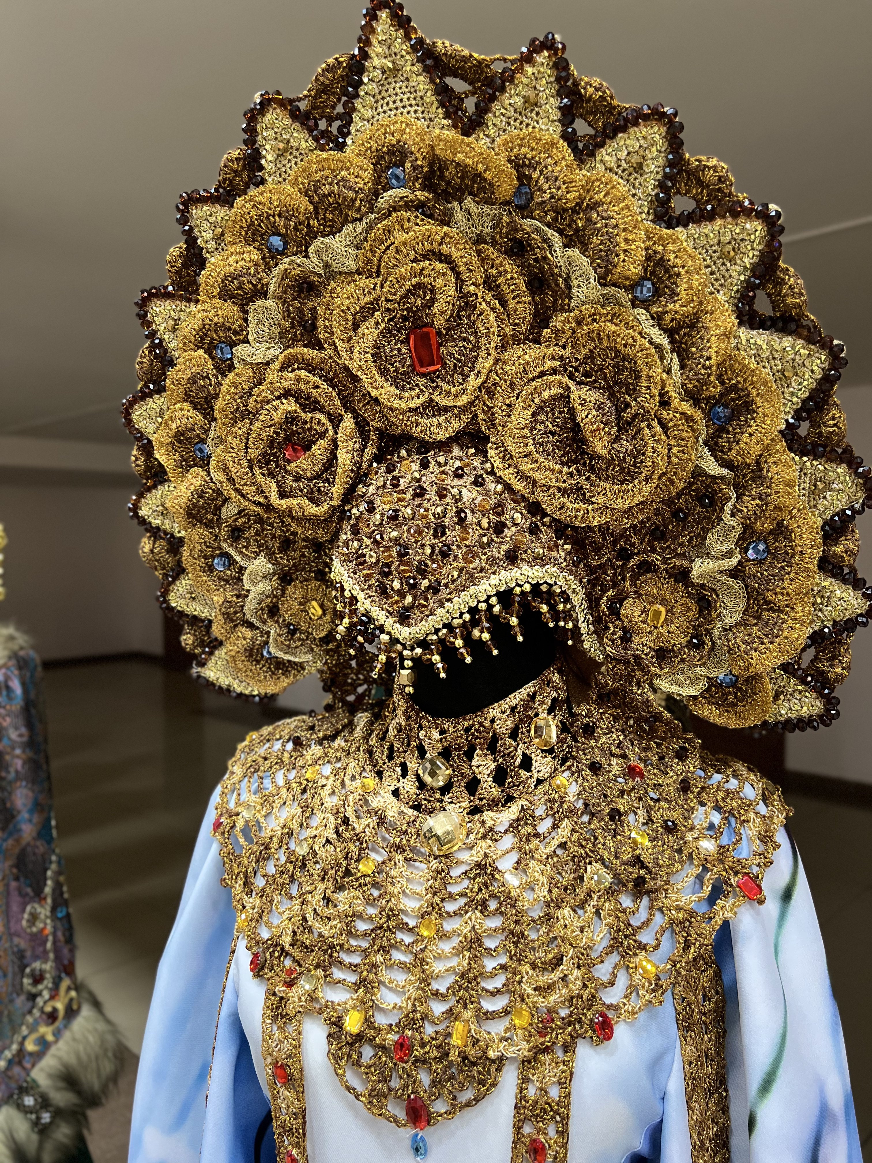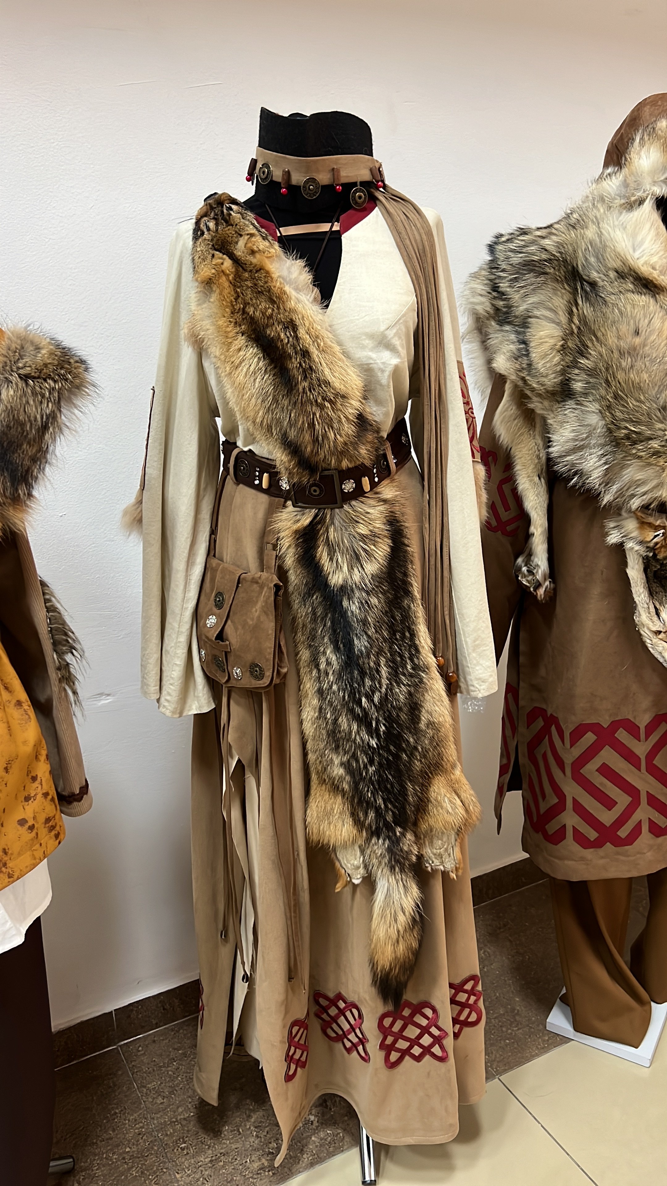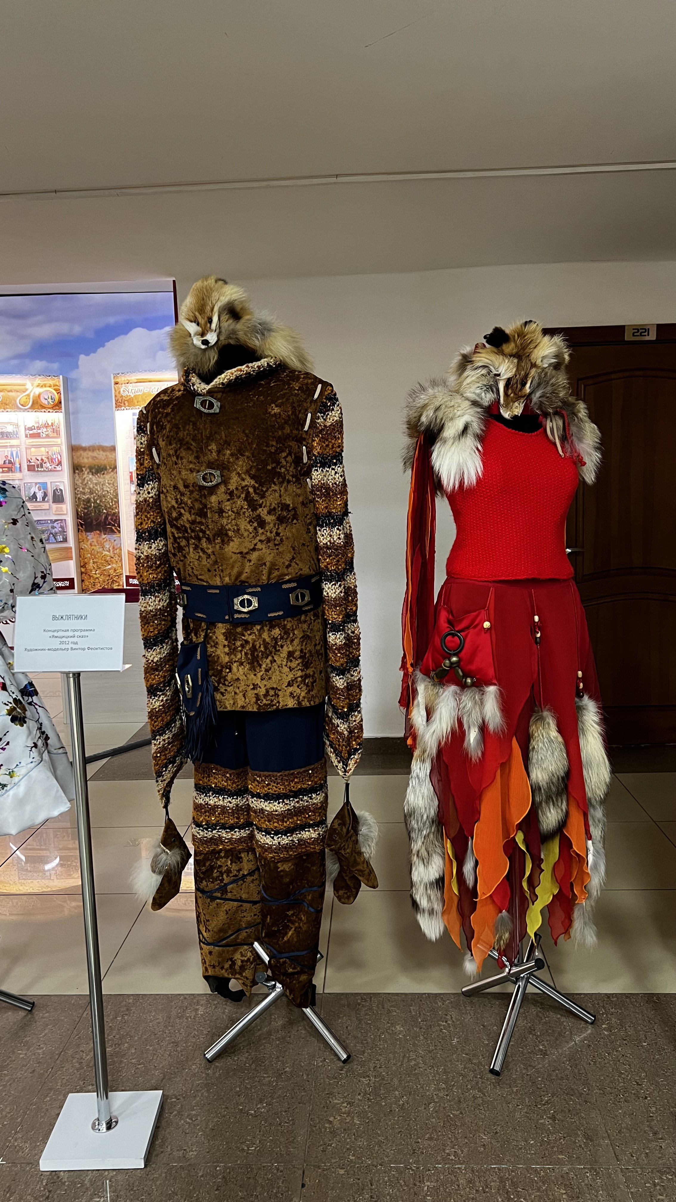Рядом — ещё одна культурная часть, будто продолжение рассказа: выставка сценических костюмов. Здесь царит уже другой ритм — живой, динамичный. В одном ряду — меховые накидки и головные уборы с узорами, отсылающими к первобытному быту.