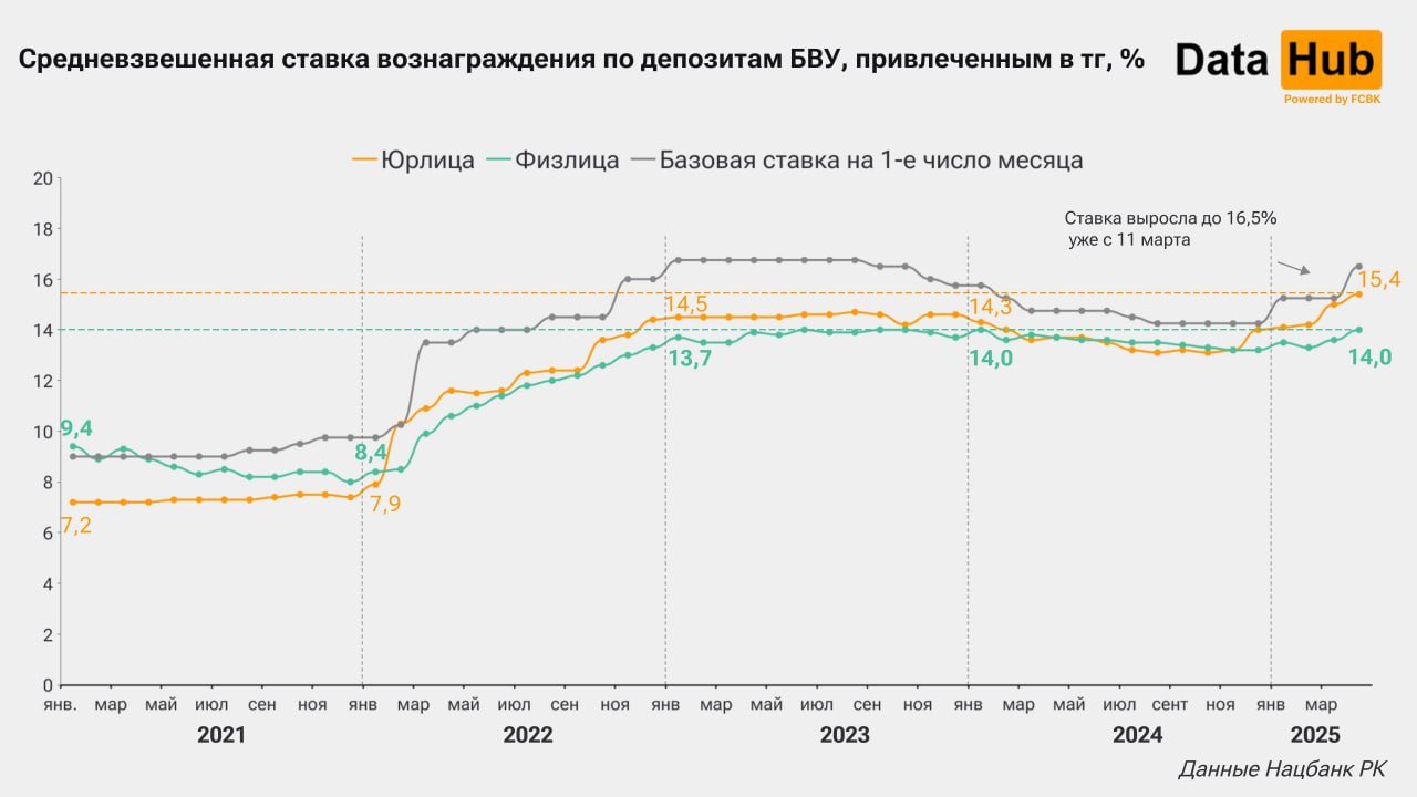 По данным Первого кредитного бюро, в апреле средневзвешенная ставка по депозитам физлиц в Казахстане достигла 14 %. Это один из самых высоких показателей с 2001 года. И ставки продолжают расти — всё дело в жёсткой денежно-кредитной политике Нацбанка.